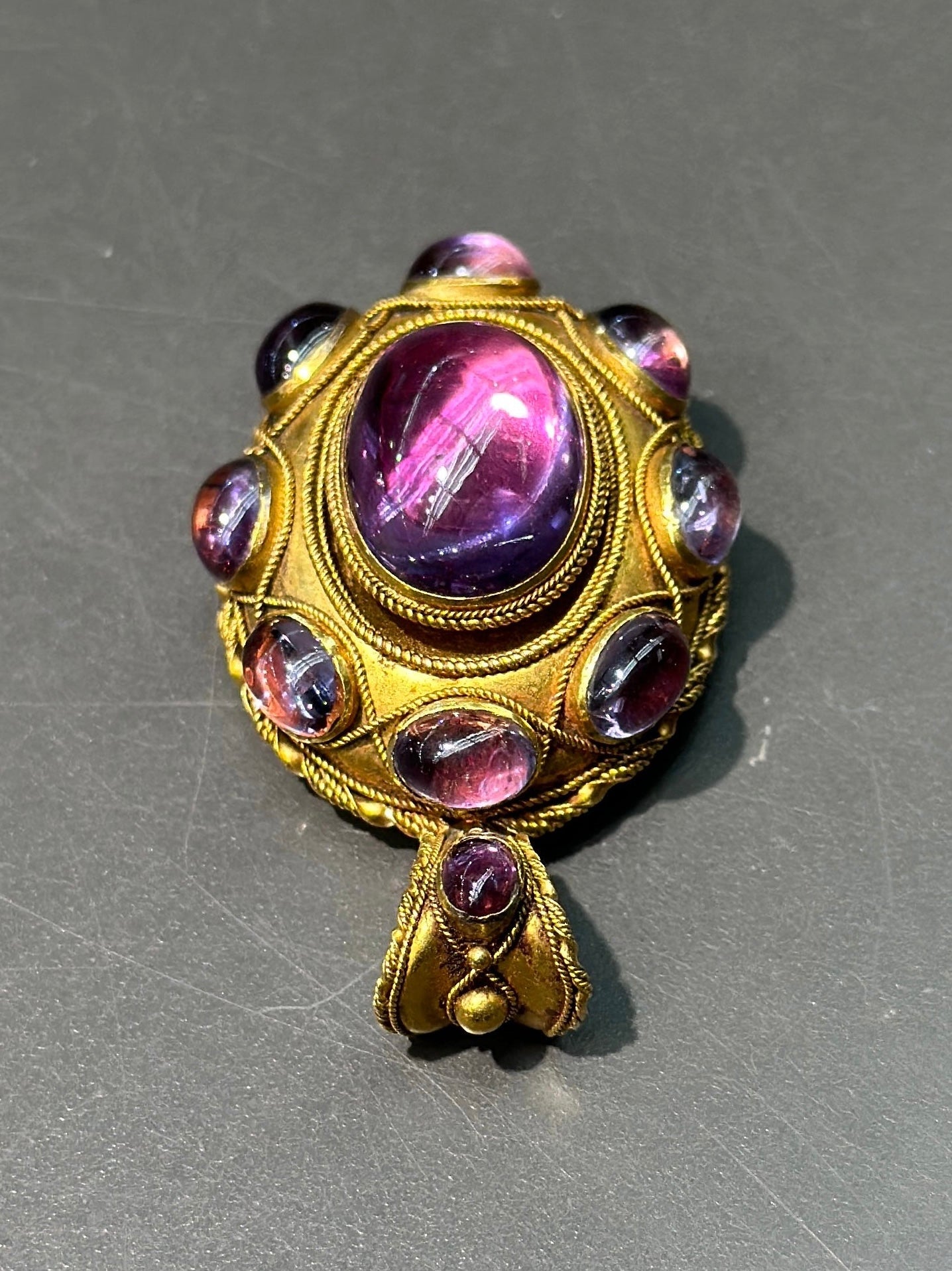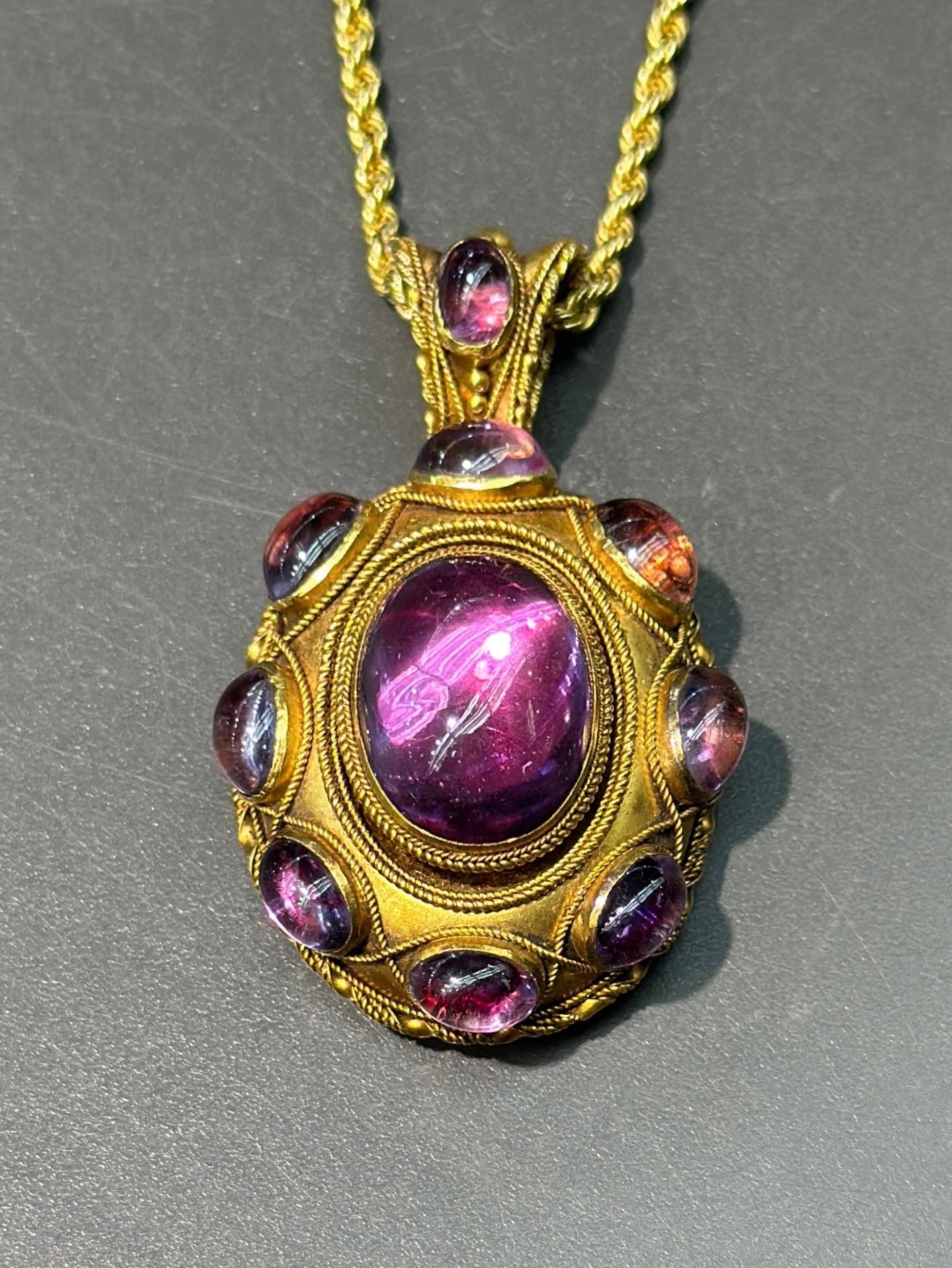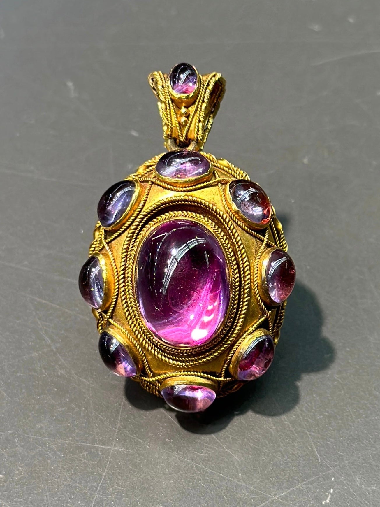独一无二的项链盒,镶有十颗闪闪发光的紫水晶,上方是引人注目的维多利亚时代项链盒,整个项链盒上装饰有细致的伊特鲁里亚复兴风格细节。采用 14K 金精心打造。