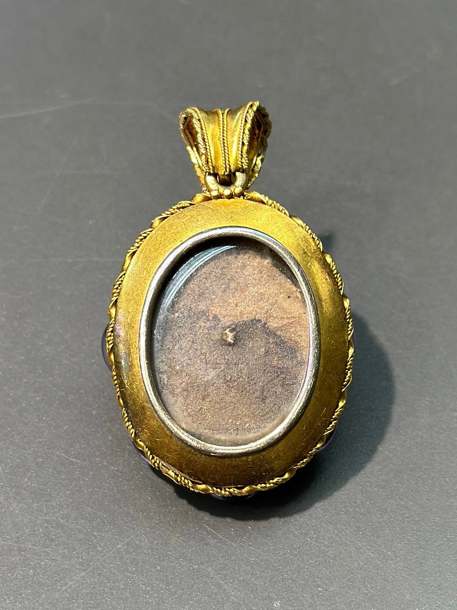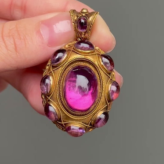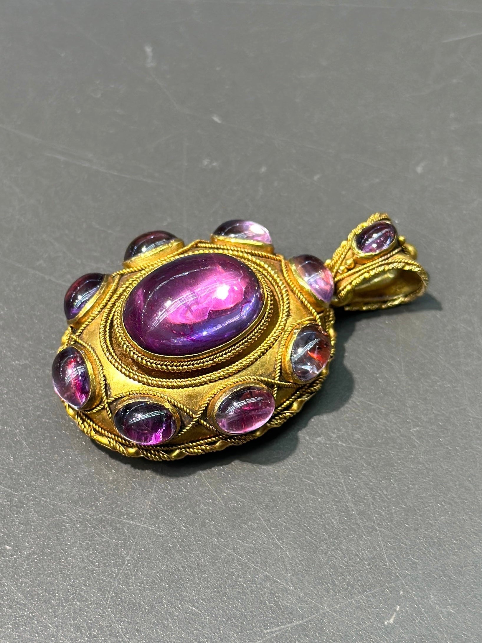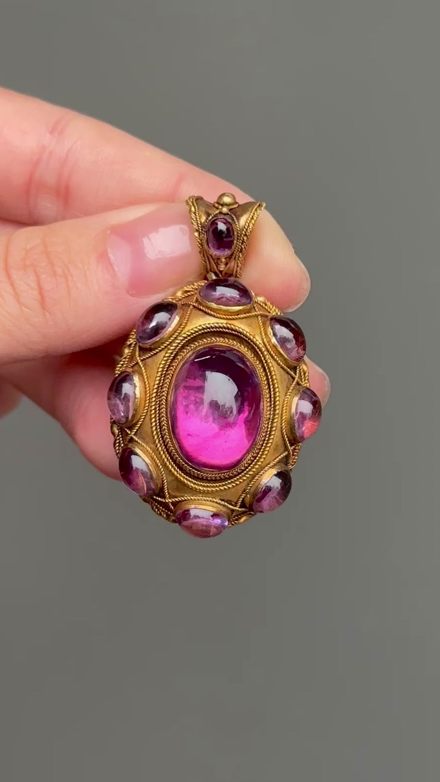 独一无二的项链盒,镶有十颗闪闪发光的紫水晶,上方是引人注目的维多利亚时代项链盒,整个项链盒上装饰有细致的伊特鲁里亚复兴风格细节。采用 14K 金精心打造。
