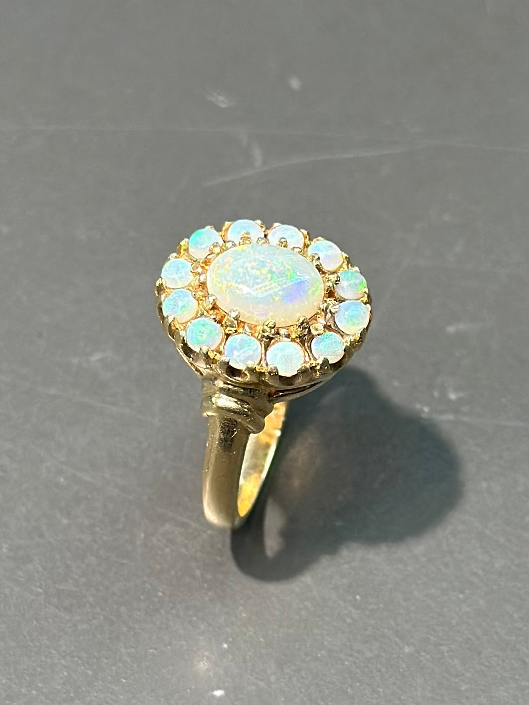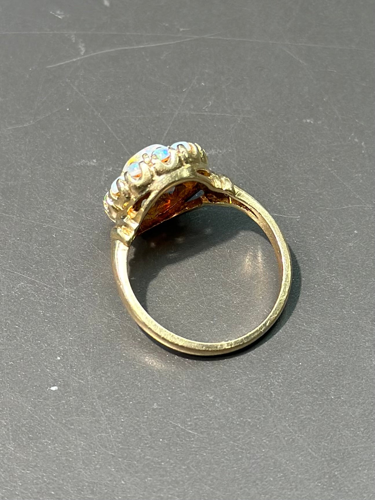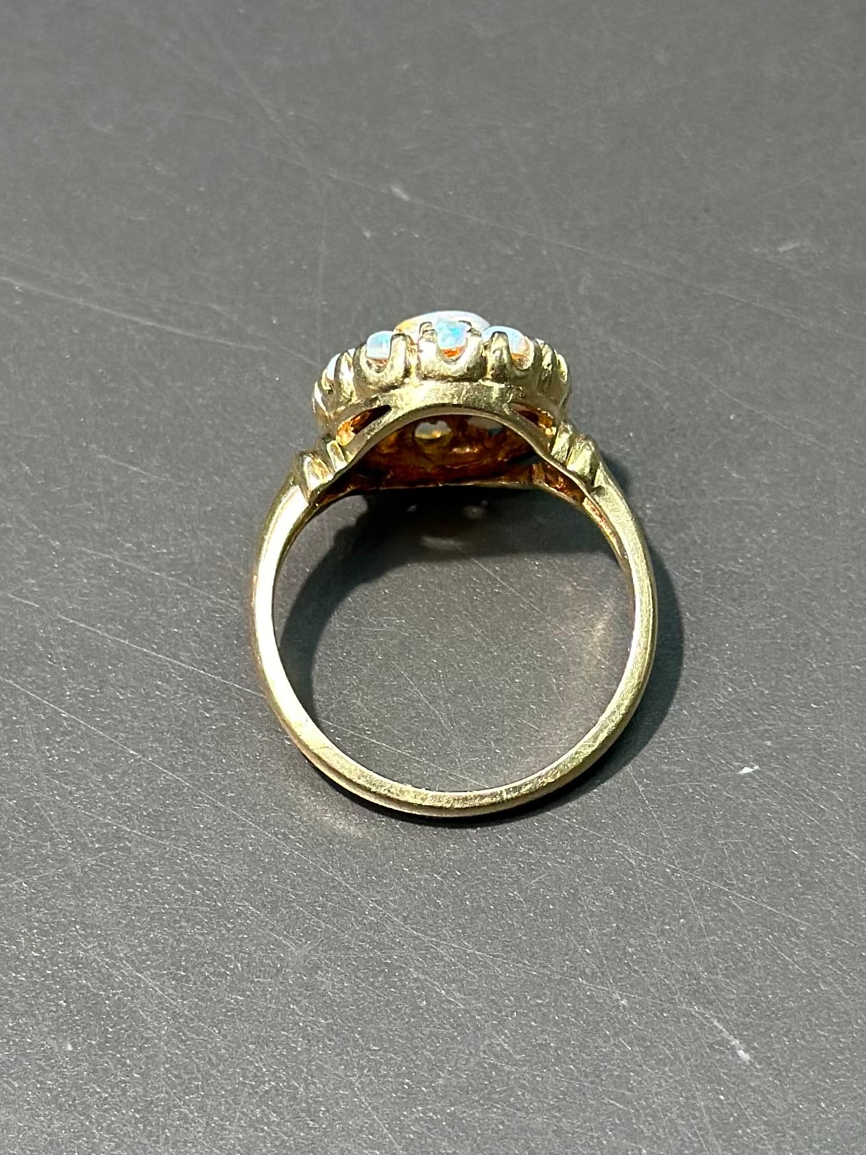 这枚极其可爱的戒指以 10K 金打造,镶有一簇闪闪发光的蛋白石,从各个角度看都呈现出华丽的色彩。