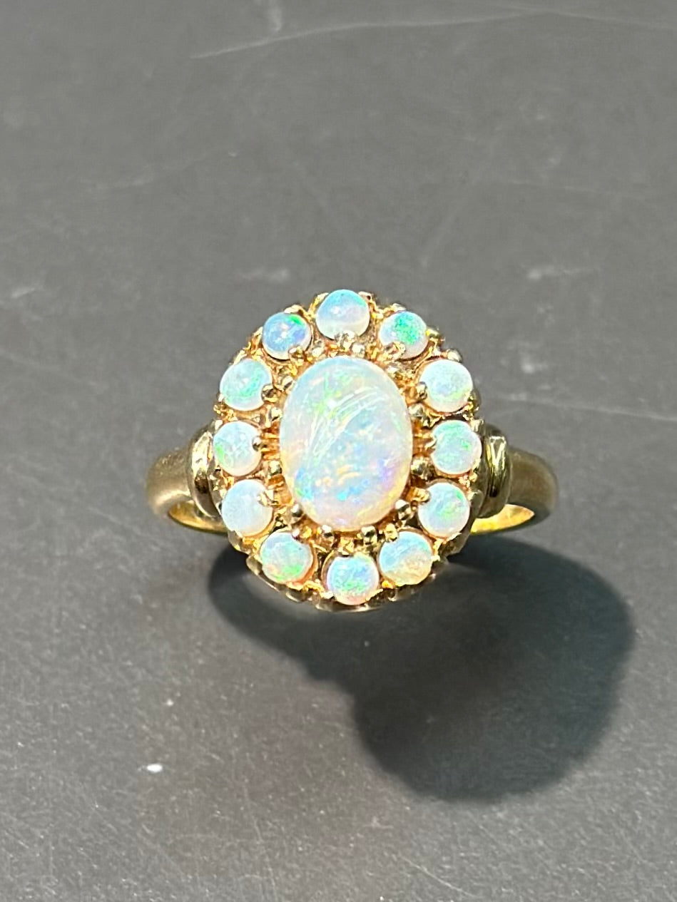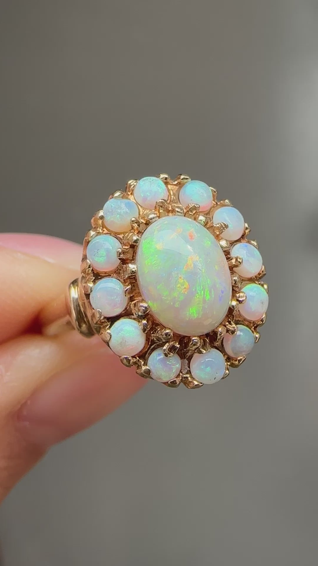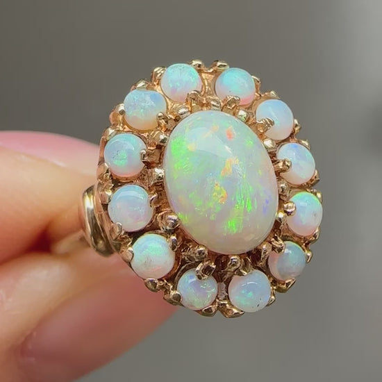 这枚极其可爱的戒指以 10K 金打造,镶有一簇闪闪发光的蛋白石,从各个角度看都呈现出华丽的色彩。
