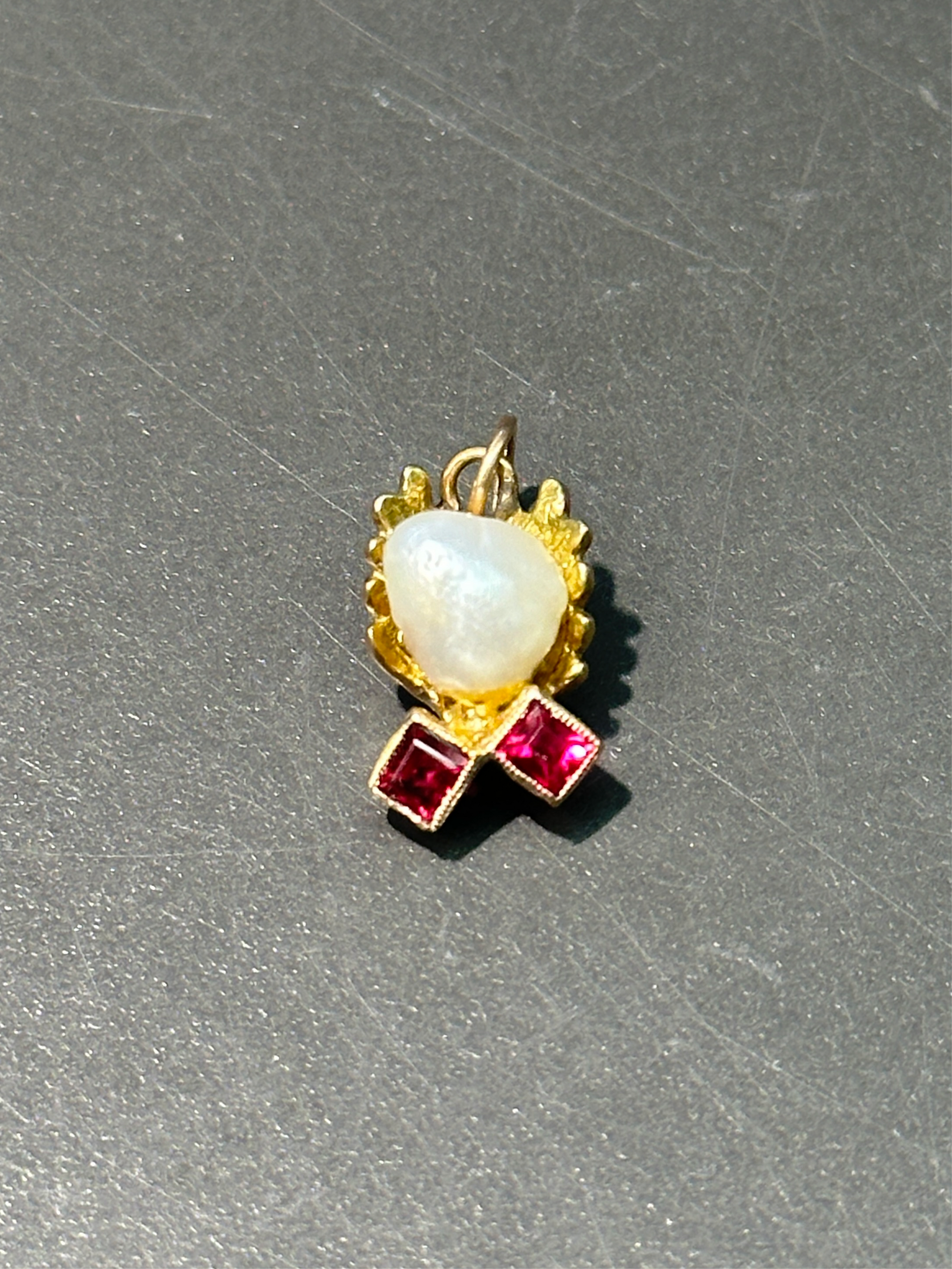 曾经是别针,现在却成了饰品!一颗有光泽的白色珍珠镶嵌在 14K 金上,配以两颗闪闪发光的粉红色合成红宝石。