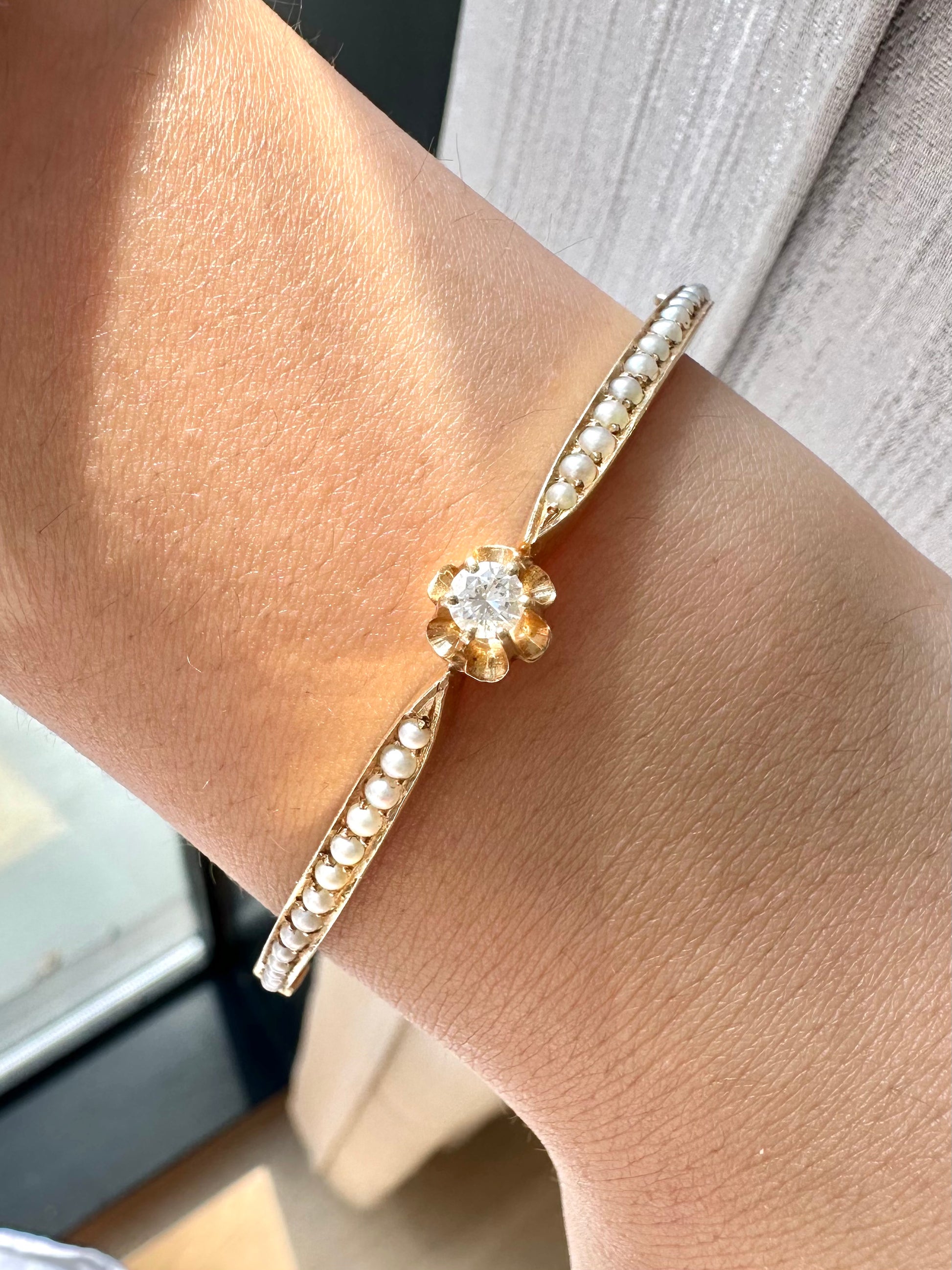 一款可爱的复古手镯,中央镶嵌一颗闪亮的圆形切割钻石,总重 0.25 克拉(VS 净度,G 颜色),镶嵌在甜美的毛茛花托上。手镯的肩部饰有细小的珍珠。采用 14K 金精心打造。