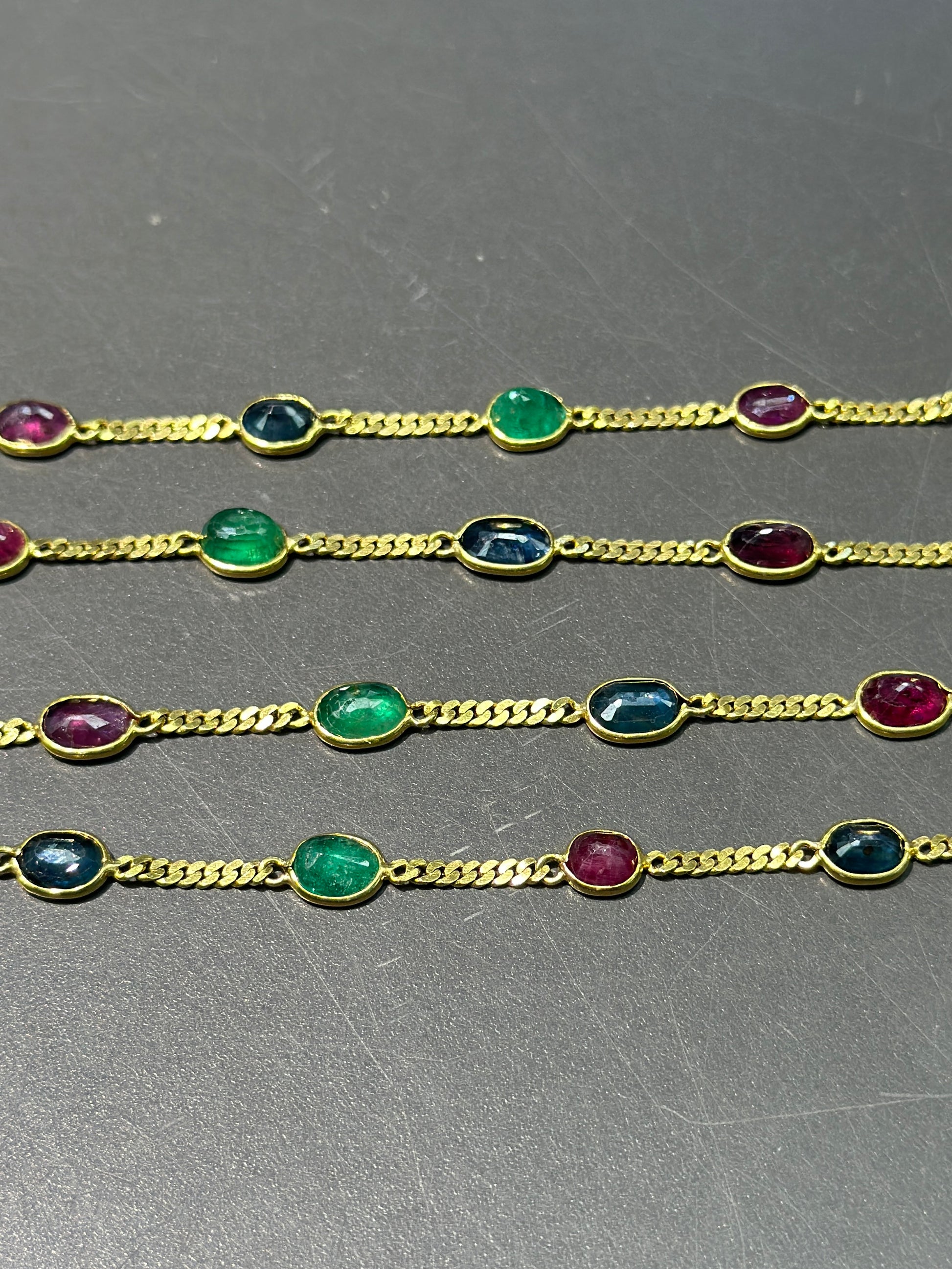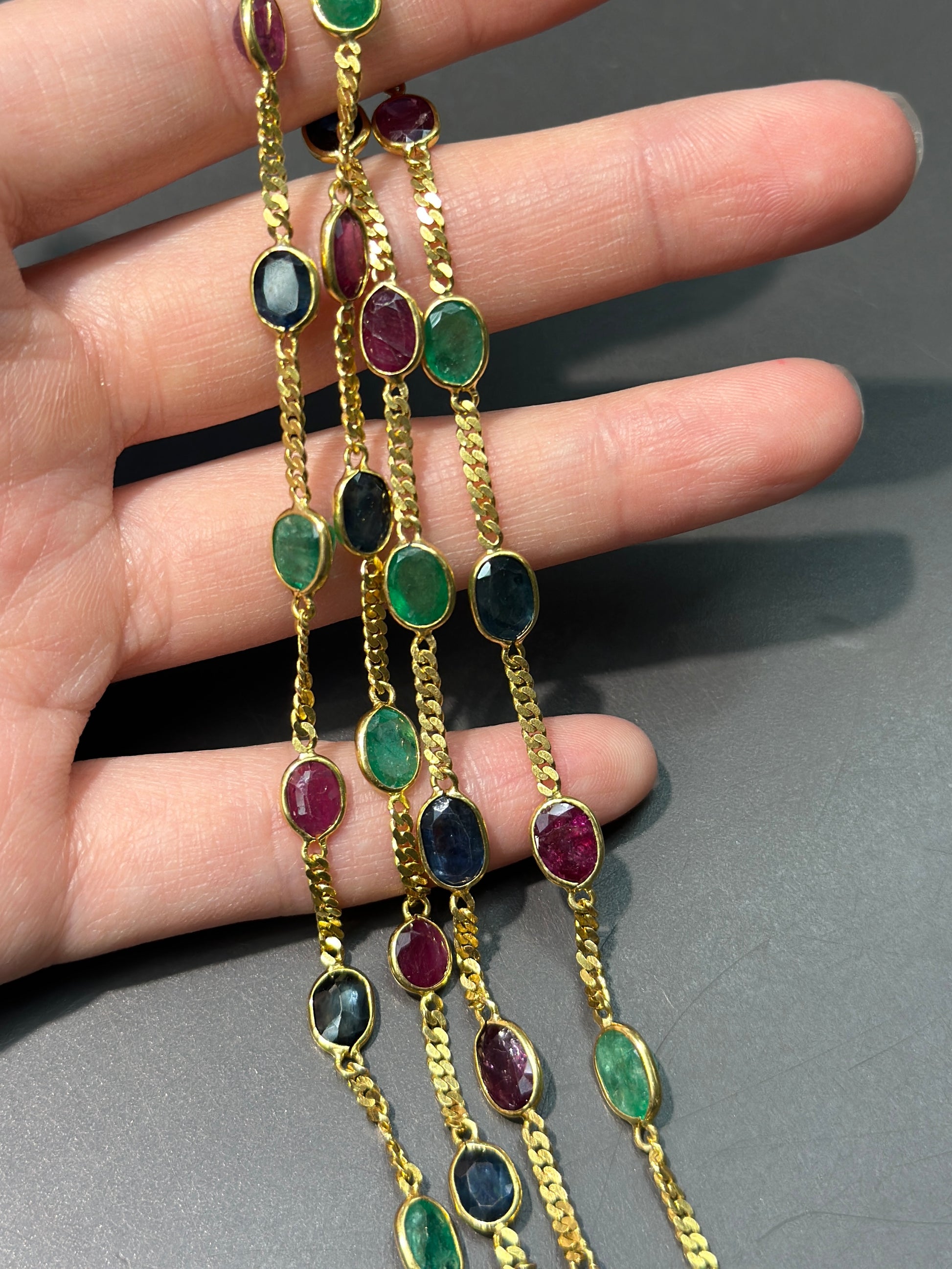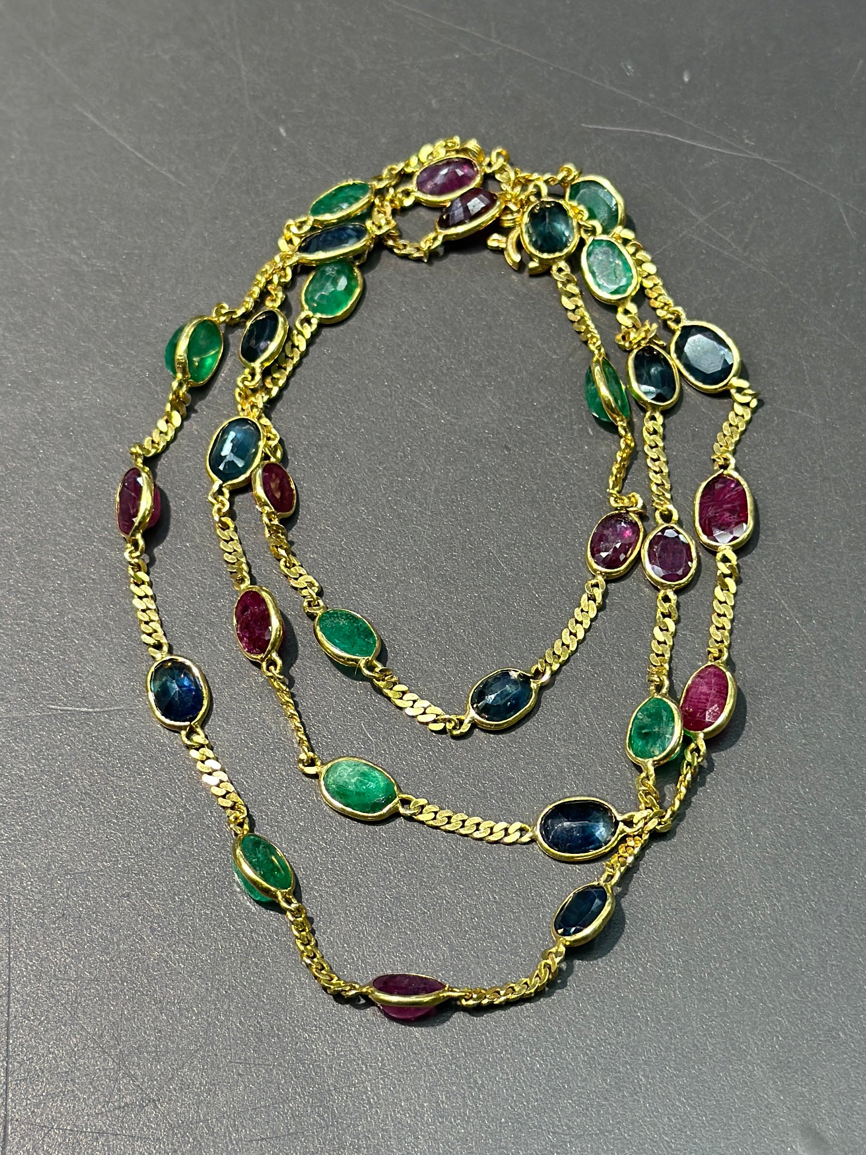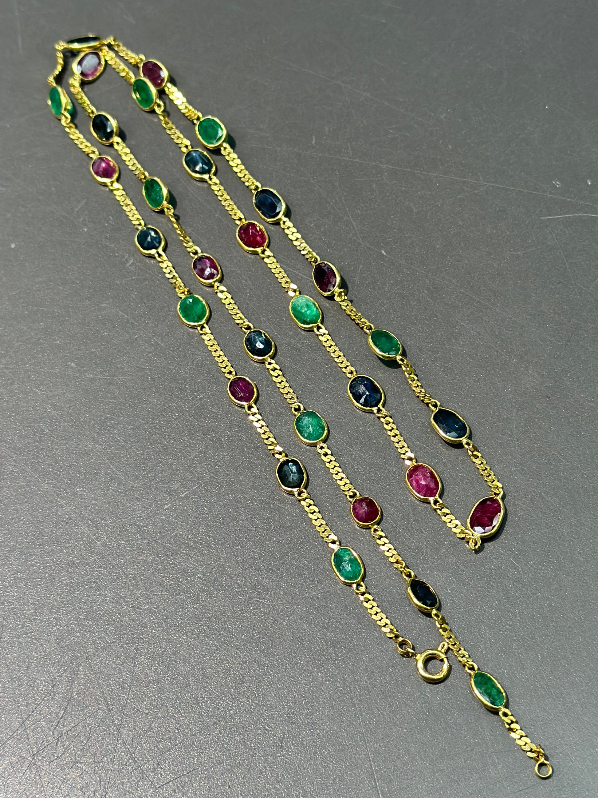 复古 18K 黄金绿宝石蓝宝石和红宝石链环项链