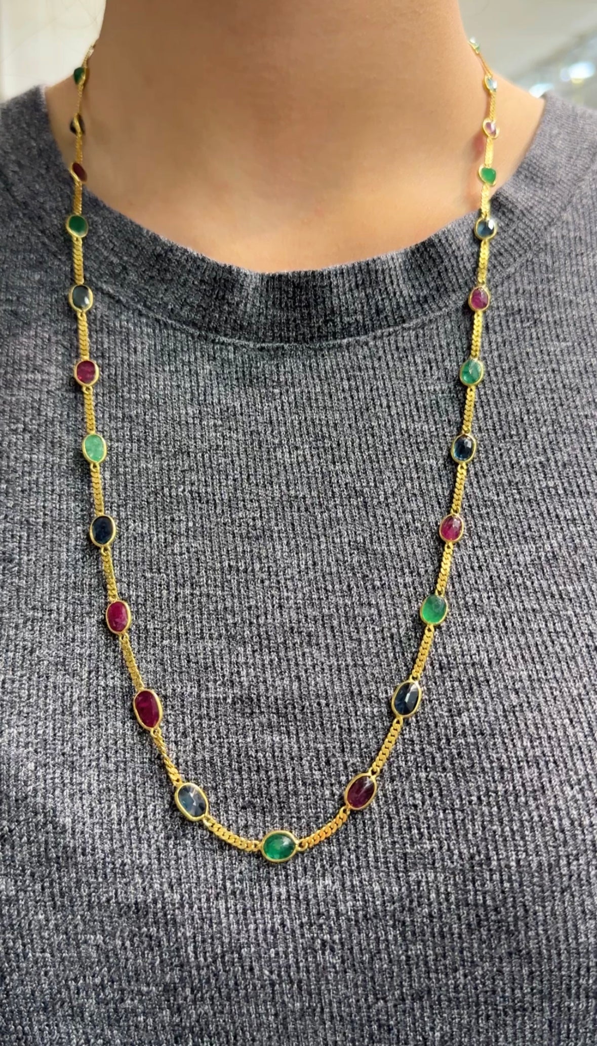 这款完美而优雅的复古链式项链上镶有 30 颗闪亮的半刻面凸圆形天然蓝宝石、红宝石和绿宝石。主要采用闪亮的 18K 黄金制成,长度为 25.5 英寸。