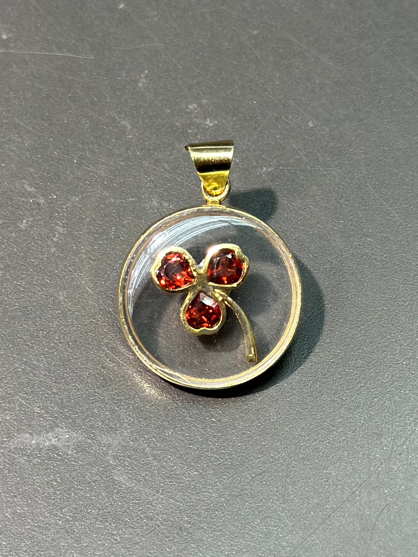 一款异想天开的摇动吊坠,采用 14K 金打造,镶嵌着一朵三叶草,上面镶嵌着三颗充满活力的心形石榴石