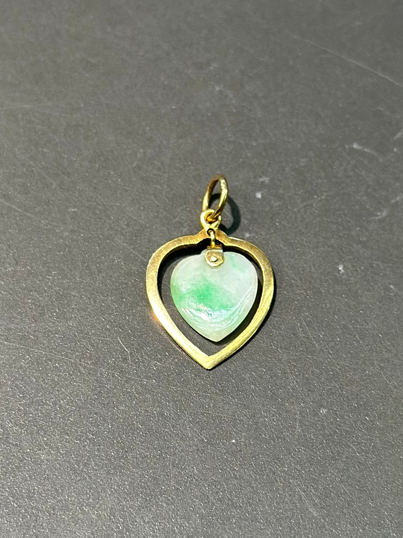 一颗可爱的开放式心形吊饰,中间是一颗心形的苹果绿色玉石。