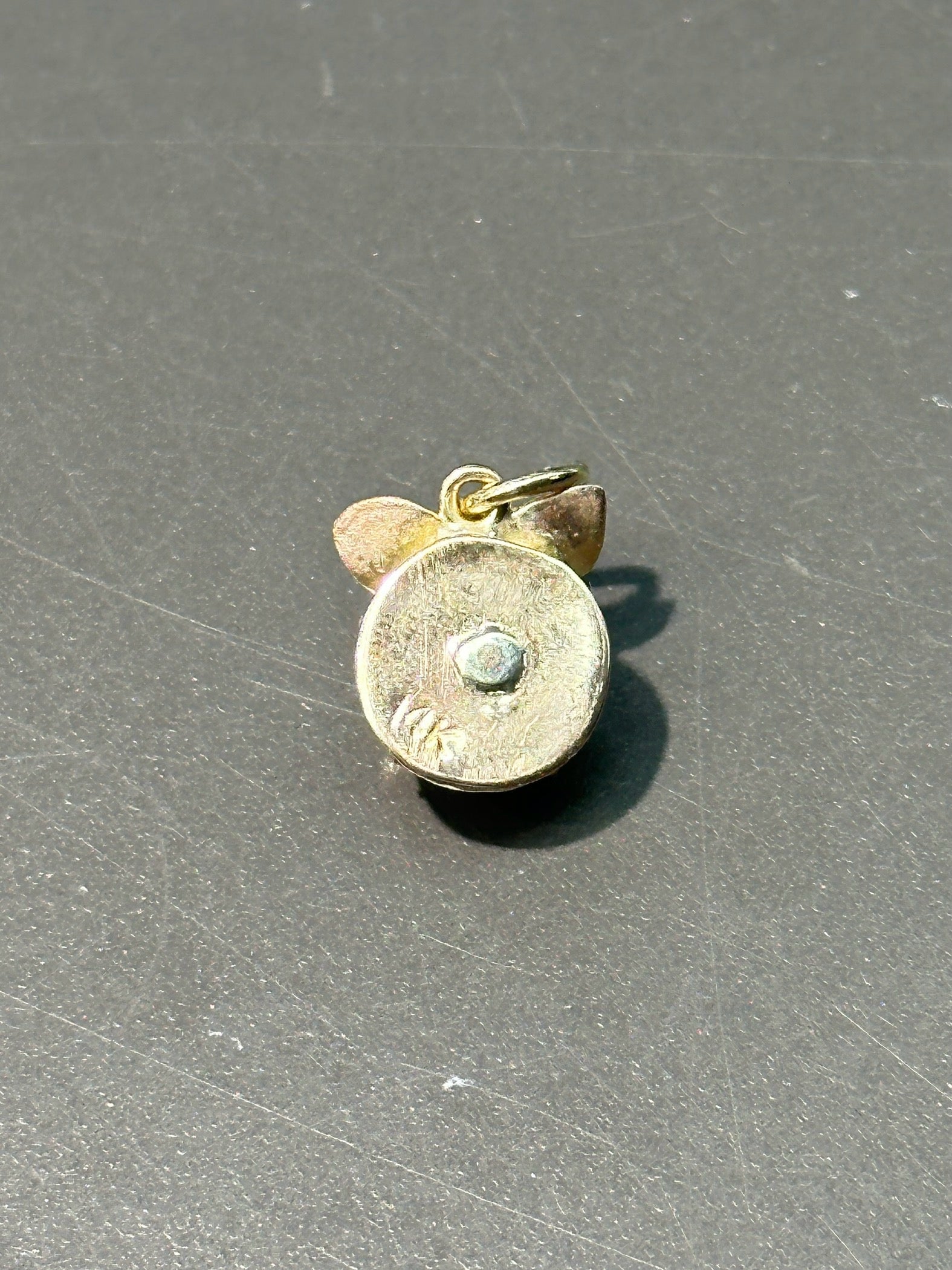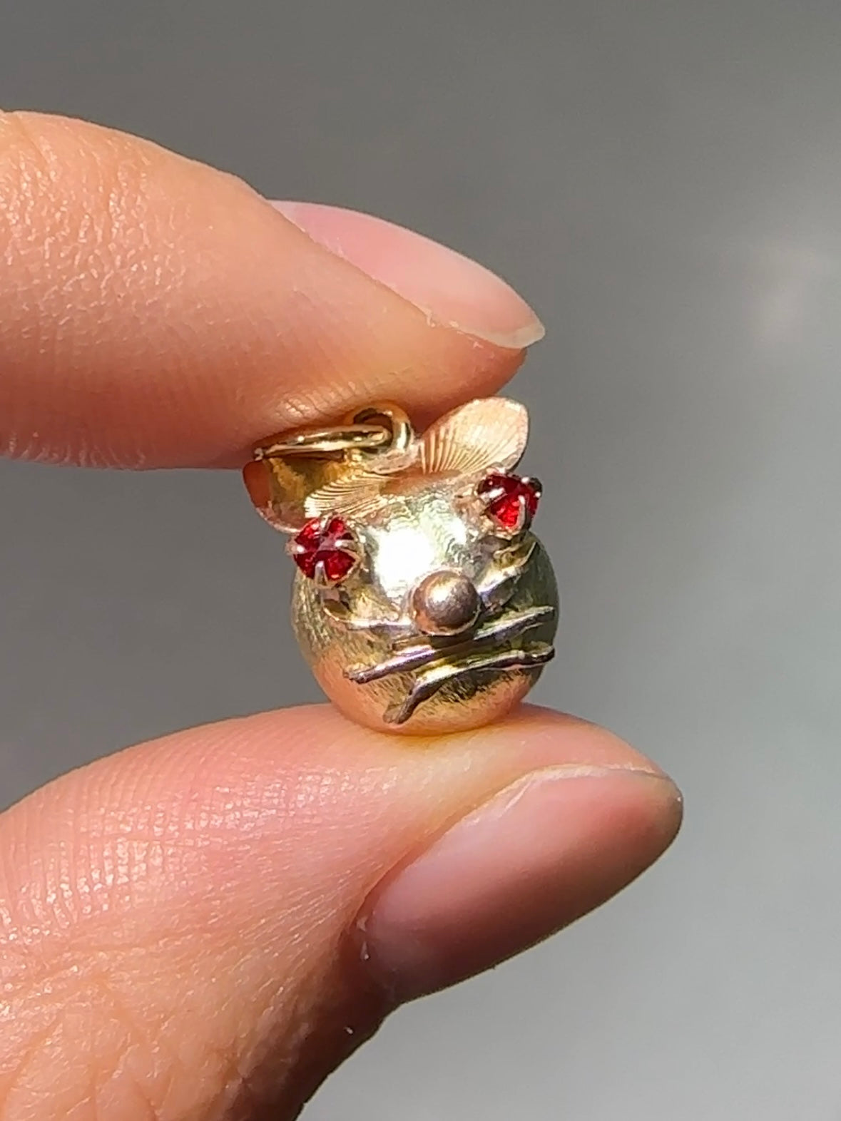 一款异想天开的小老鼠吊饰,以 14K 金打造,眼睛镶嵌合成红宝石。