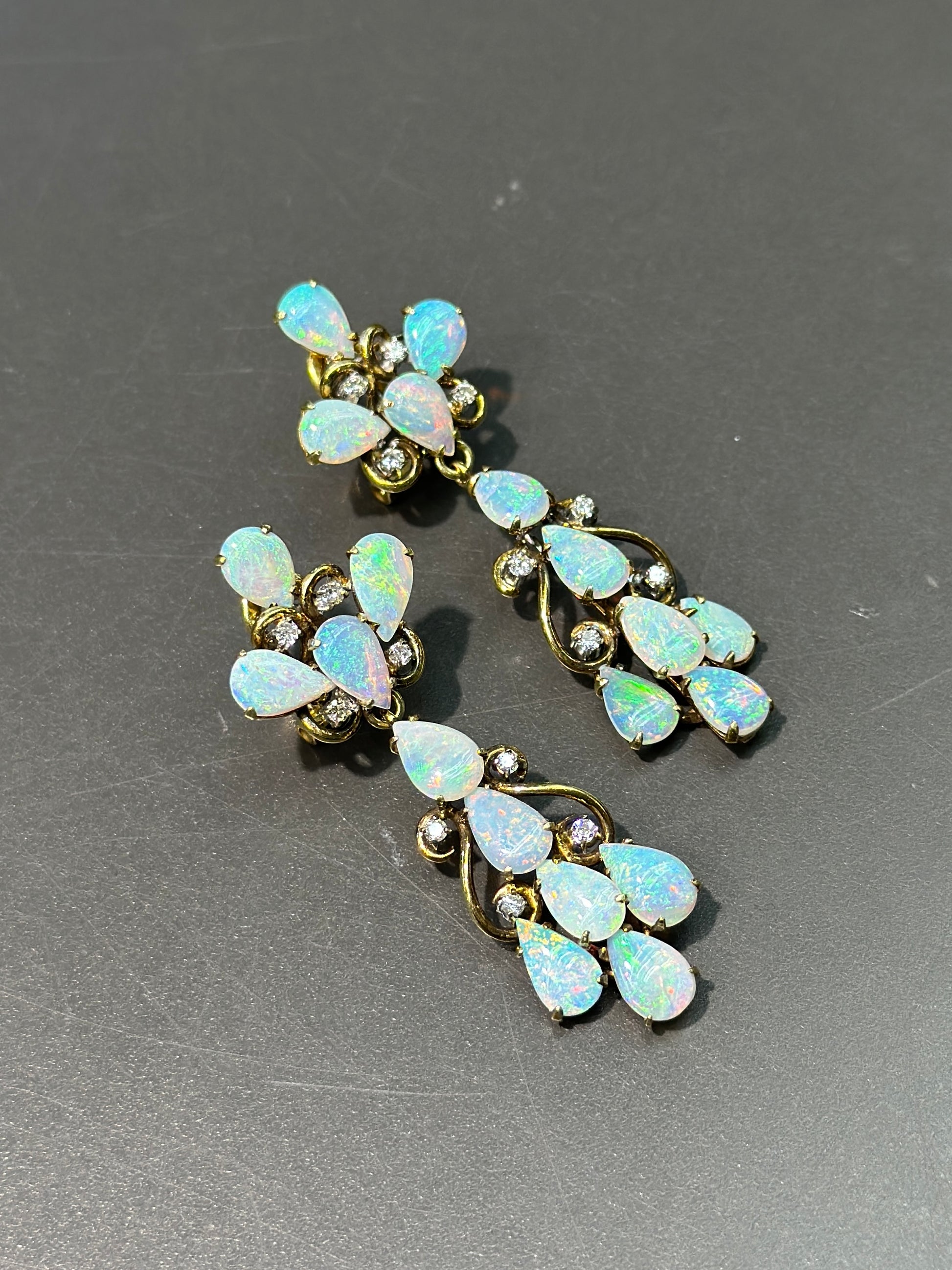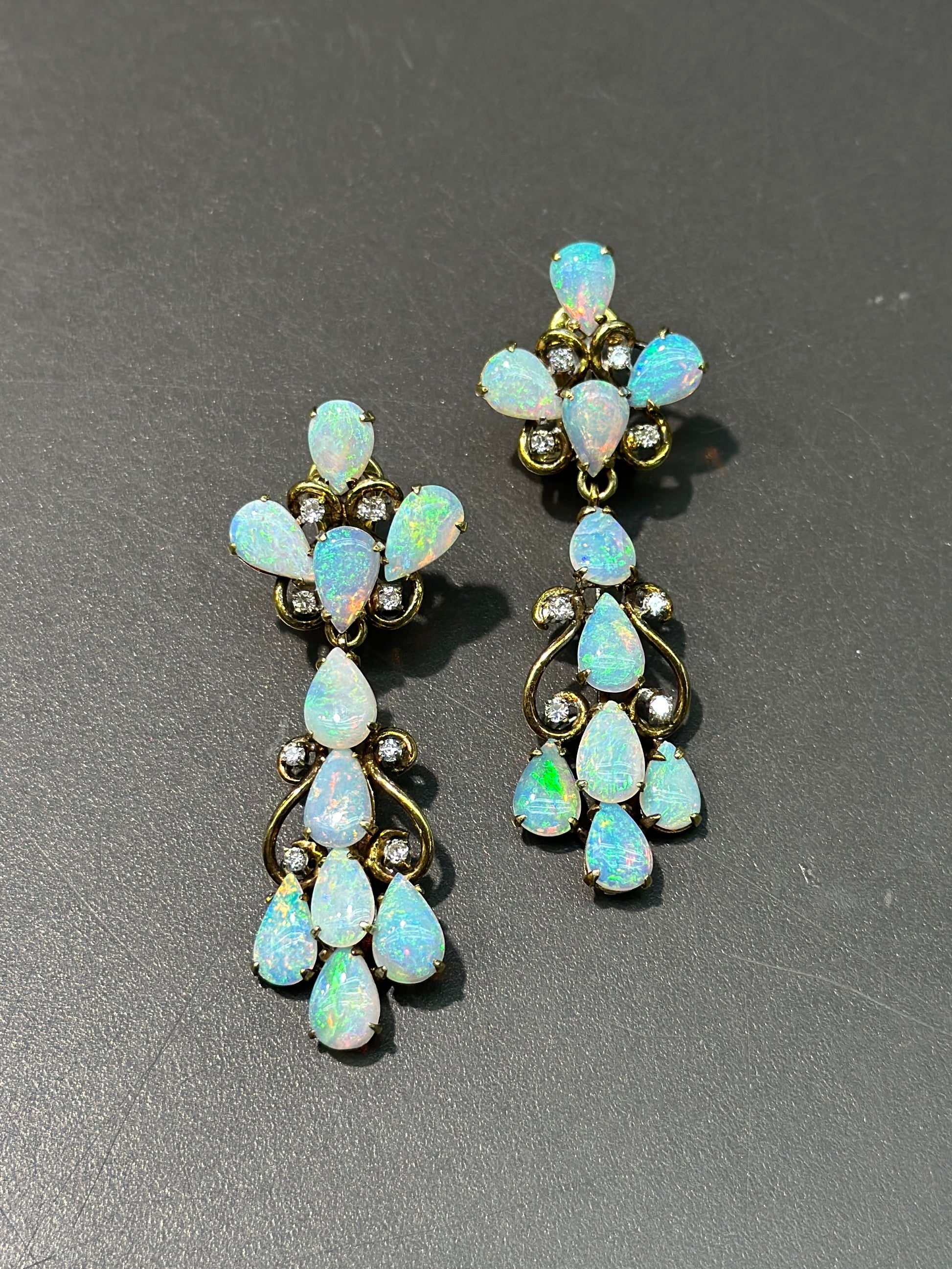 一对华丽夺目的吊式耳环,饰有迷人的水滴形蛋白石,颜色呈电光彩虹色。上面点缀着闪闪发光的白色钻石。