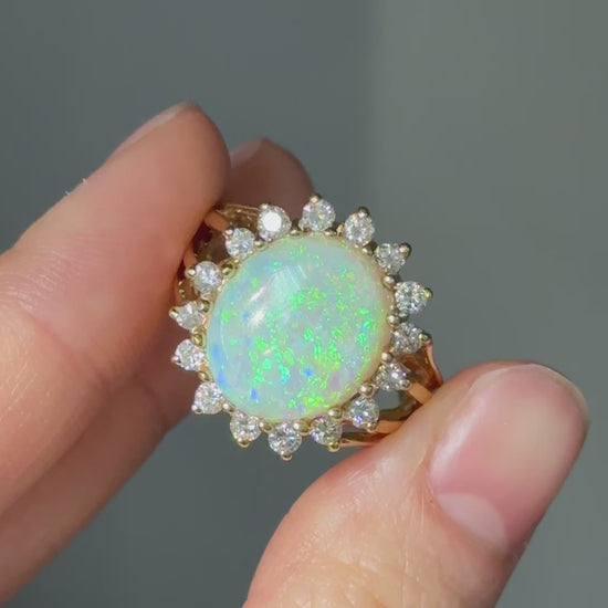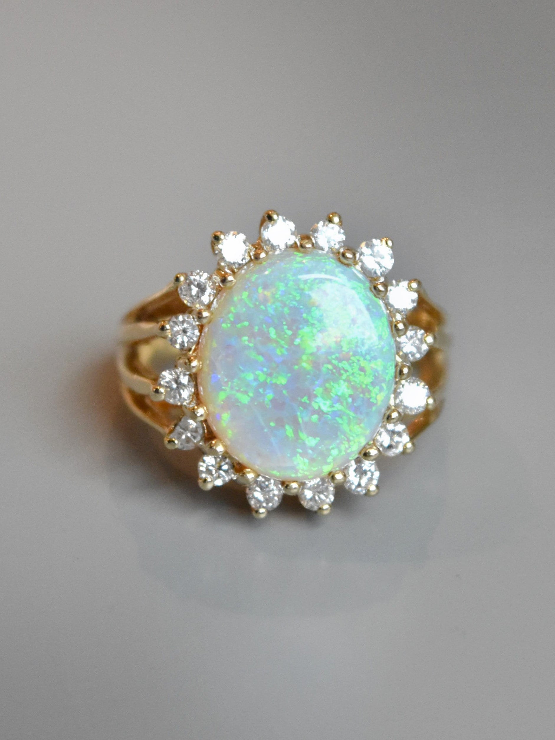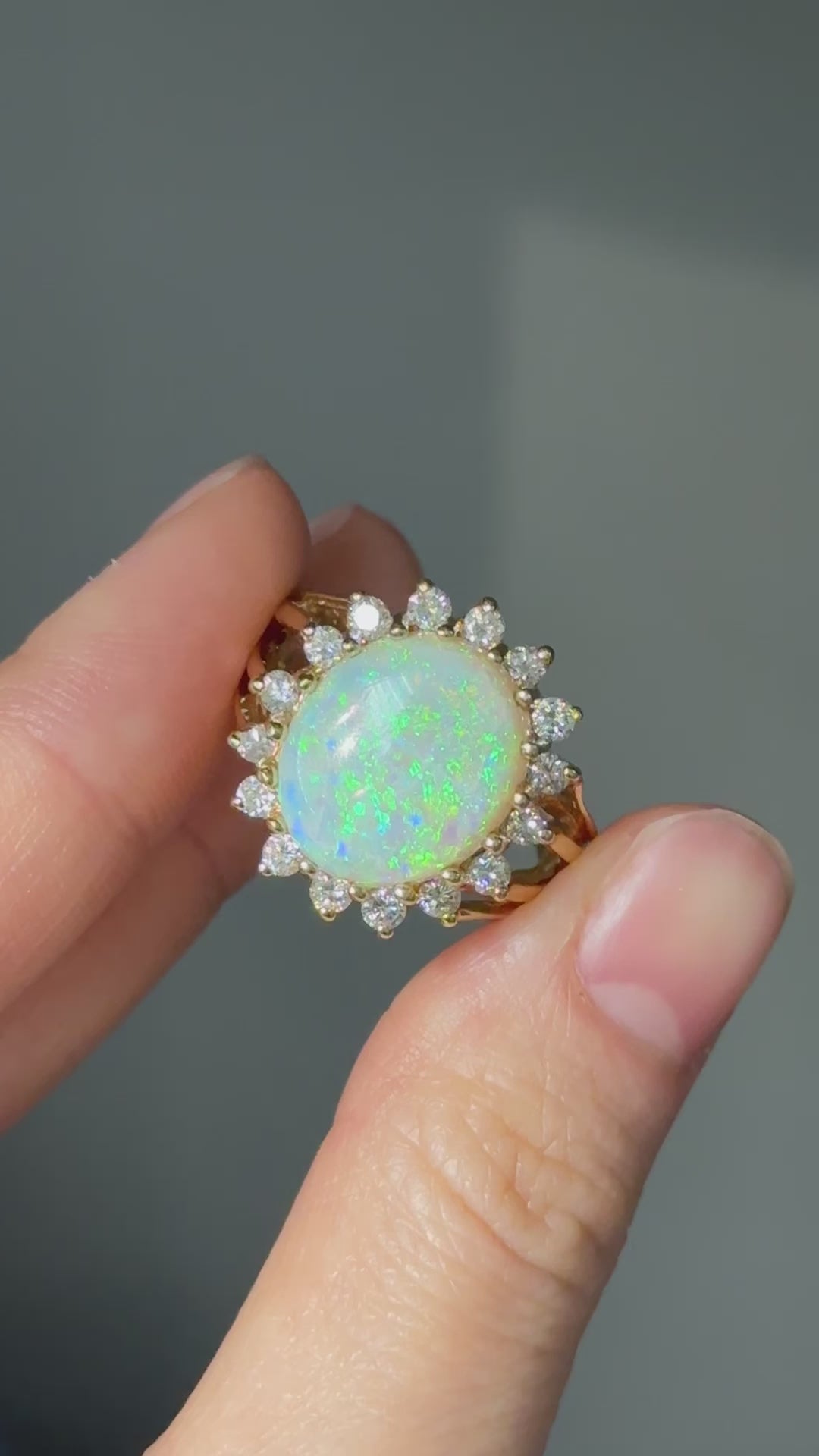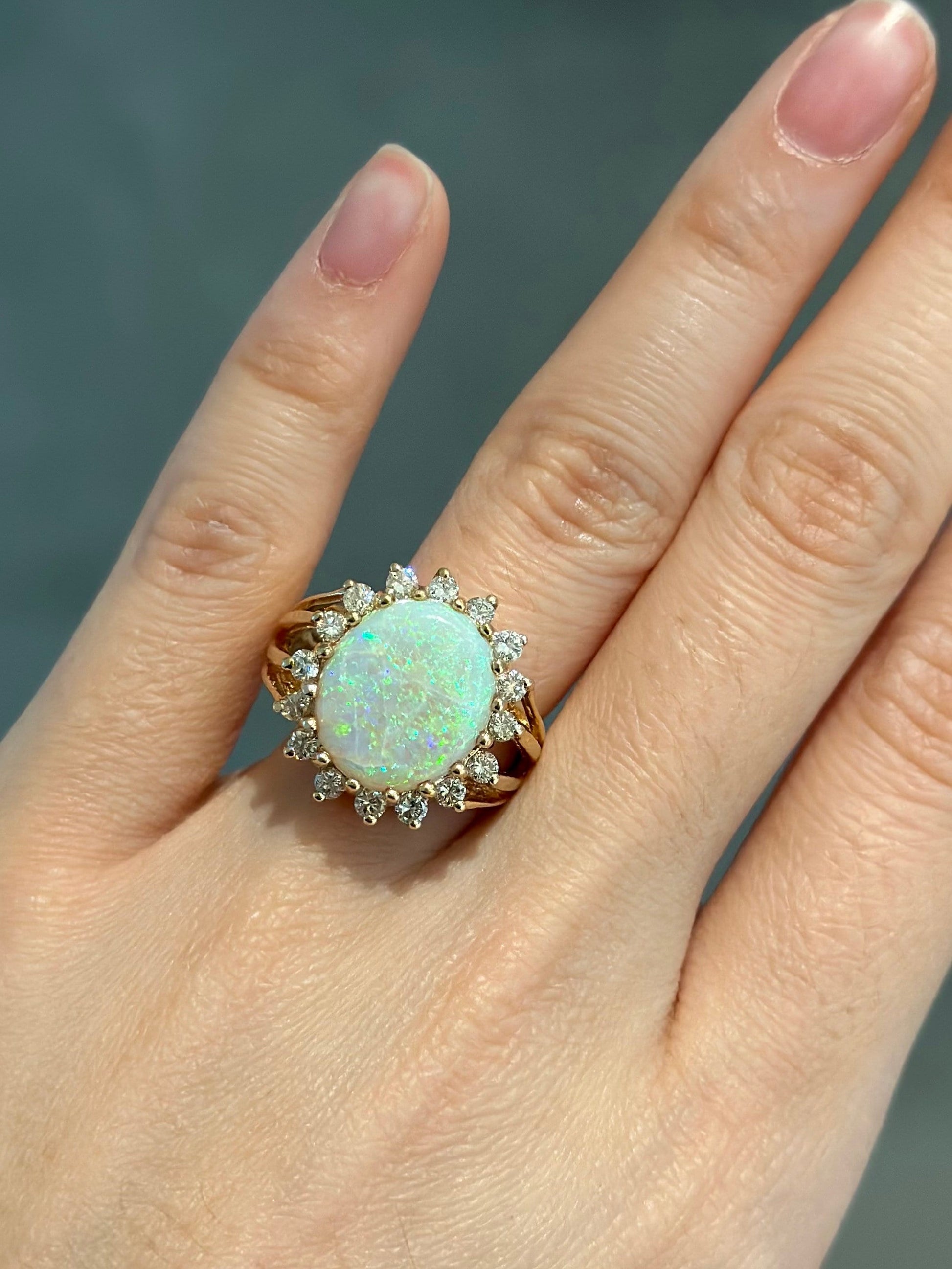 16 颗闪闪发光的白钻环绕着一颗引人注目的蛋白石凸圆形宝石,呈现出绿色、蓝色、黄色、橙色和紫色的电光彩虹色。采用 14K 金手工制作,尺寸为 7。