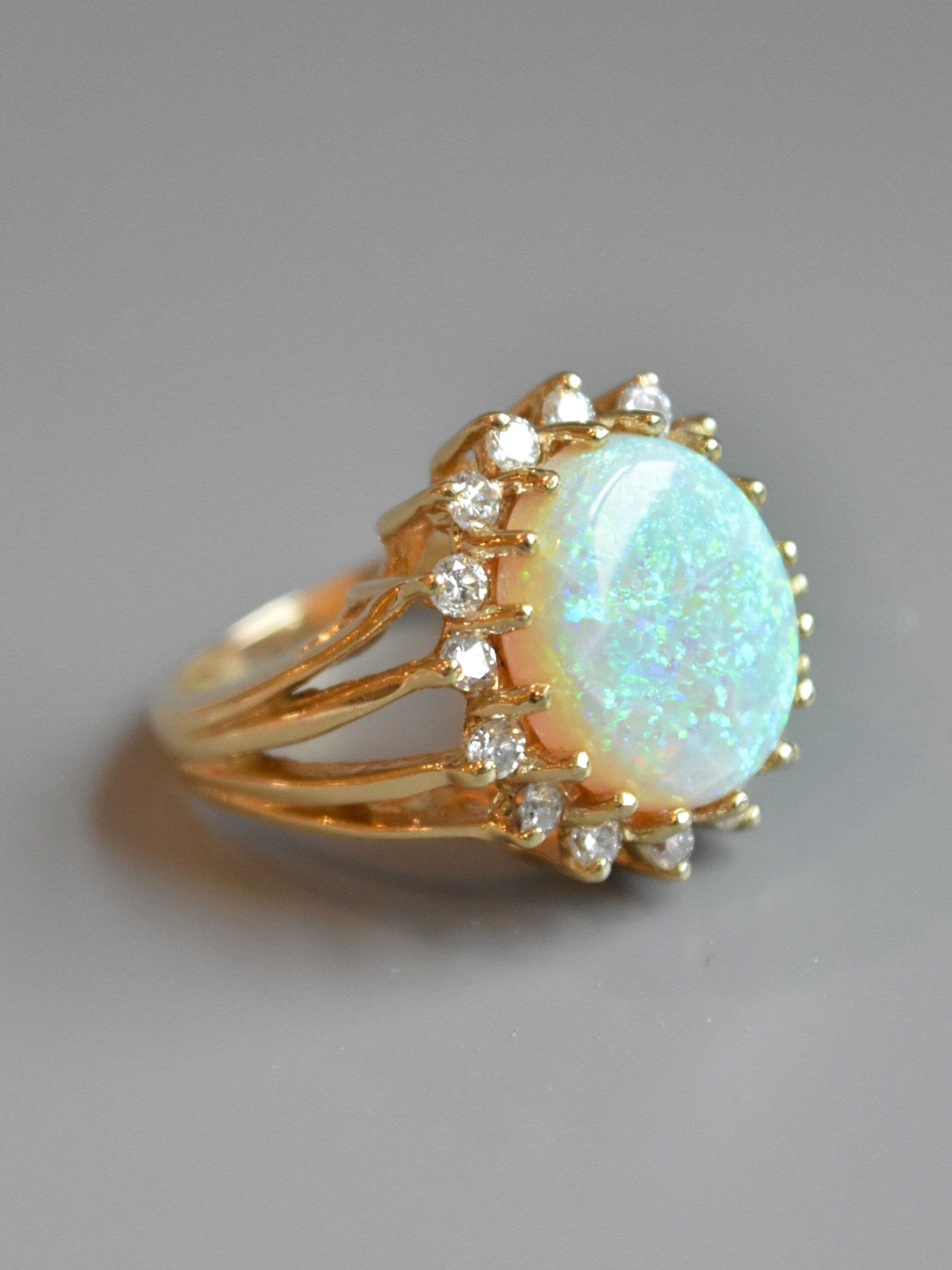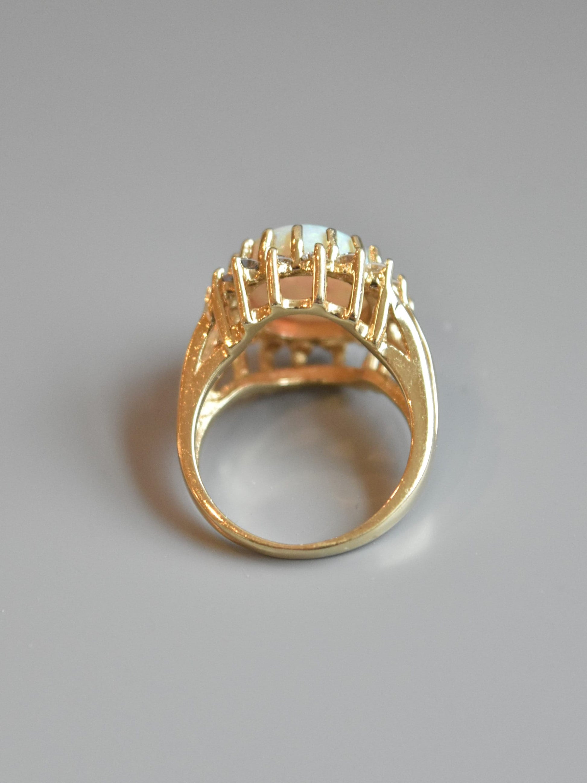 复古 14K 金蛋白石钻石光环戒指 尺寸 7