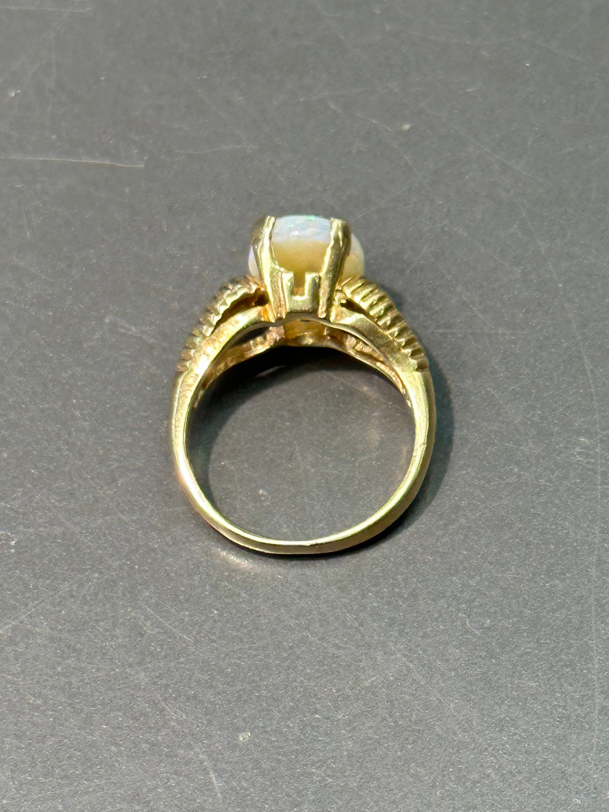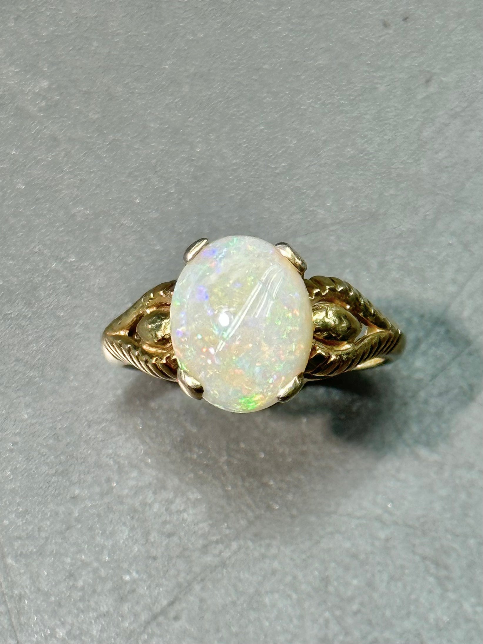 这枚戒指采用 14K 金制成,中心镶嵌着一颗白色蛋白石,周围点缀着黄色、粉色、紫色和橙色的电光色彩。简单而完美!