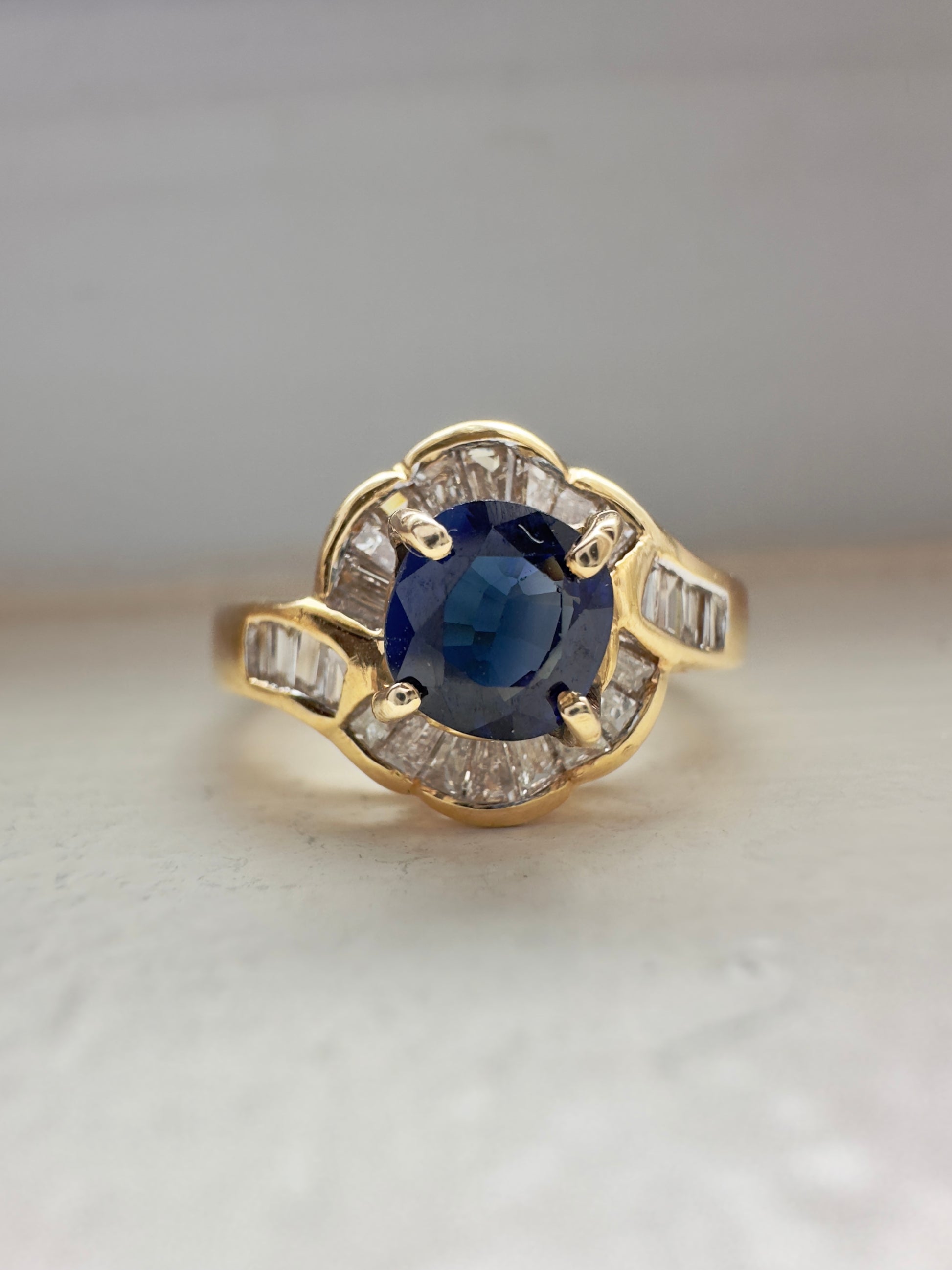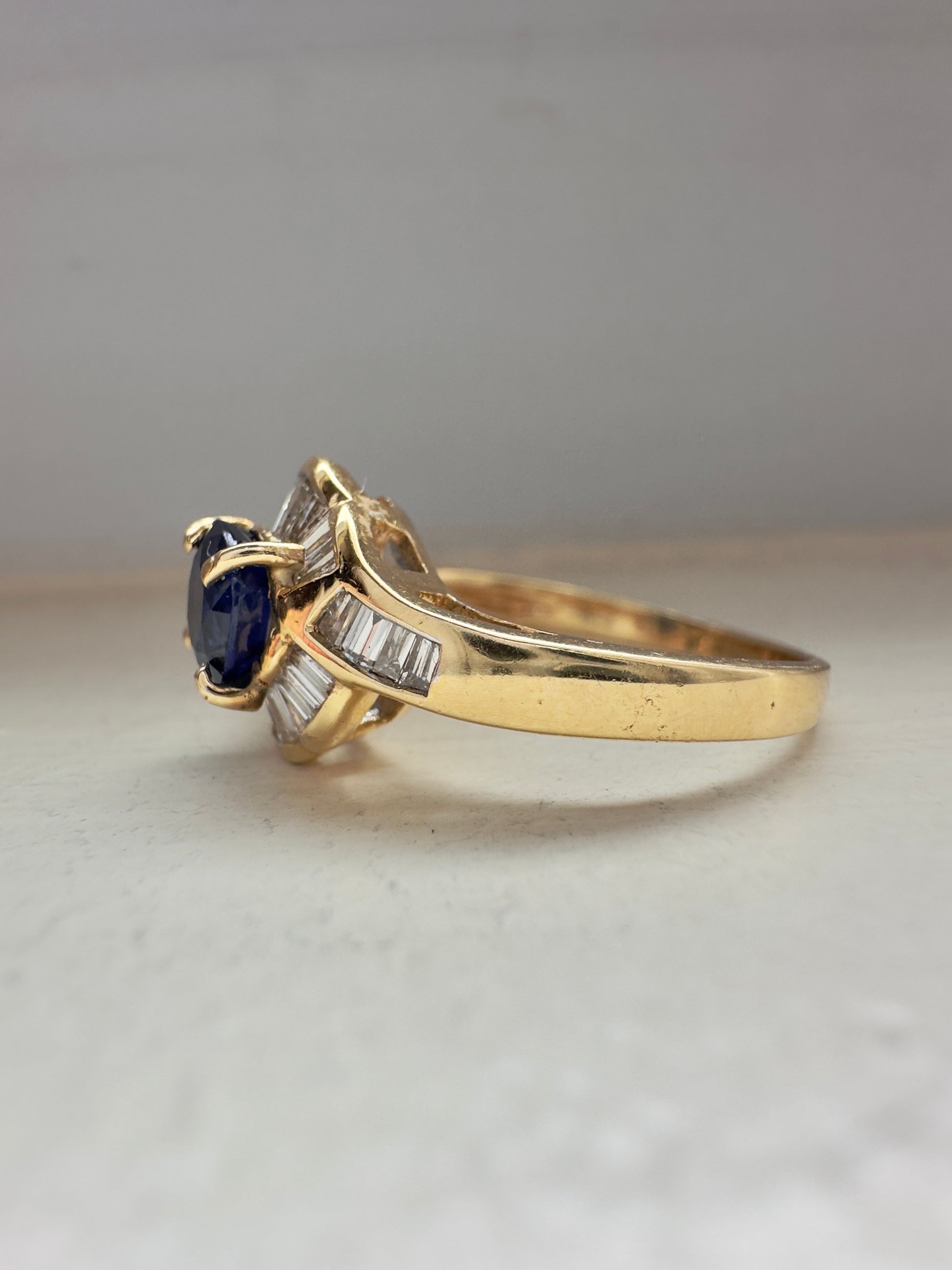 一颗鲜艳的深蓝色蓝宝石镶嵌在 14K 金上,周围环绕着闪闪发光的冰白色锥形长方形切割钻石,总重 0.65 克拉。