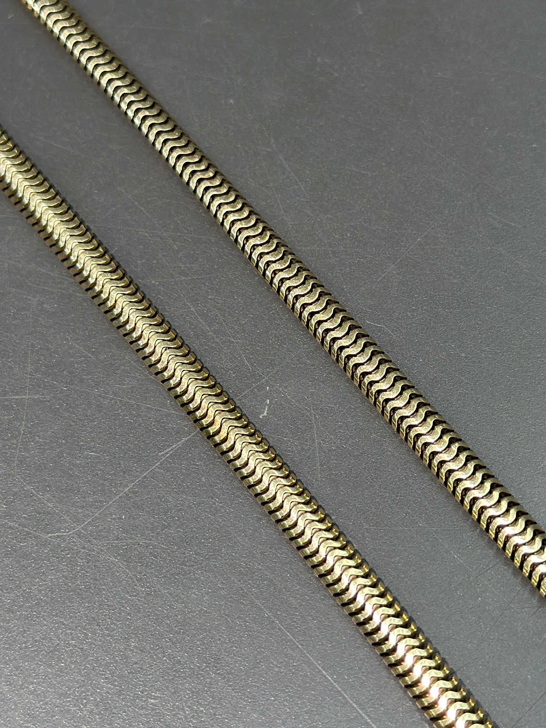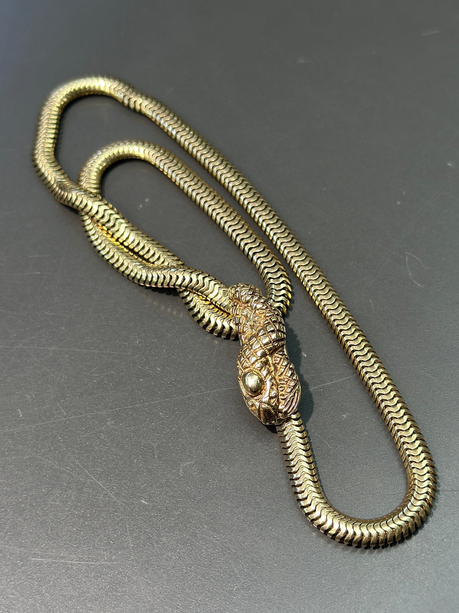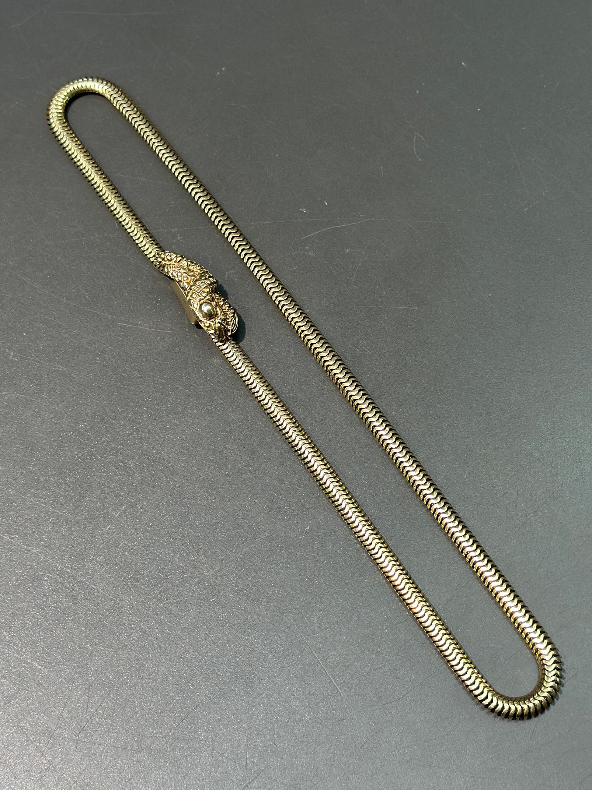 您能发现蛇吗?这款细长的蛇链项链采用 14K 金制成,大约 1940 年代。项链的扣子隐藏在蛇的下面!超级独特!状况良好,没有损坏。