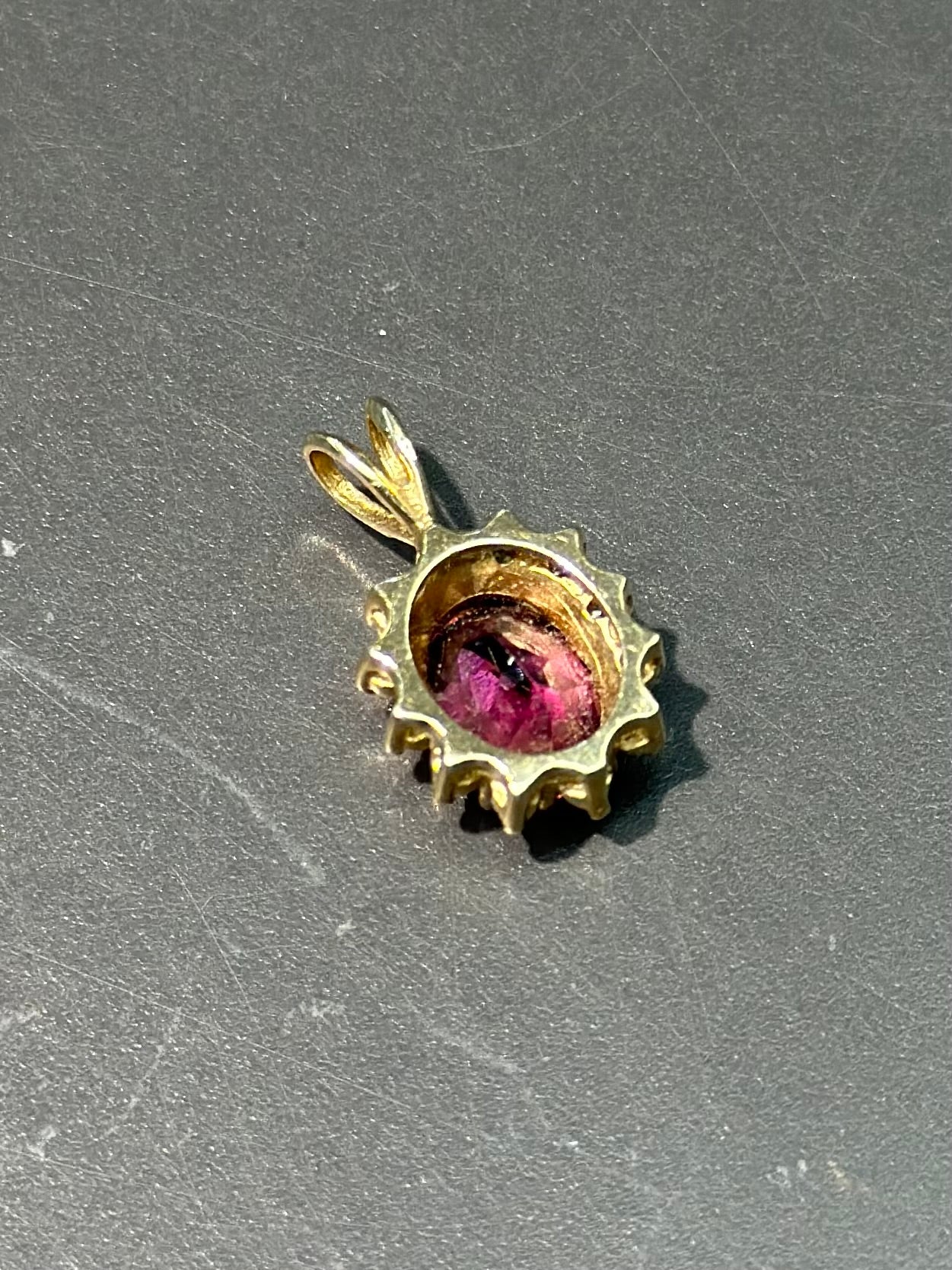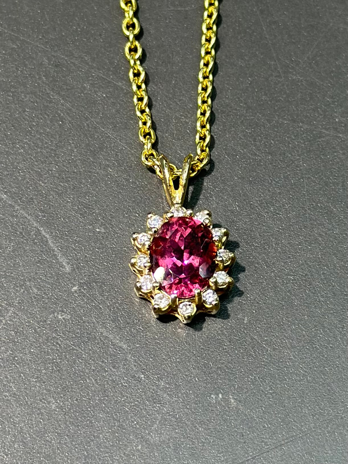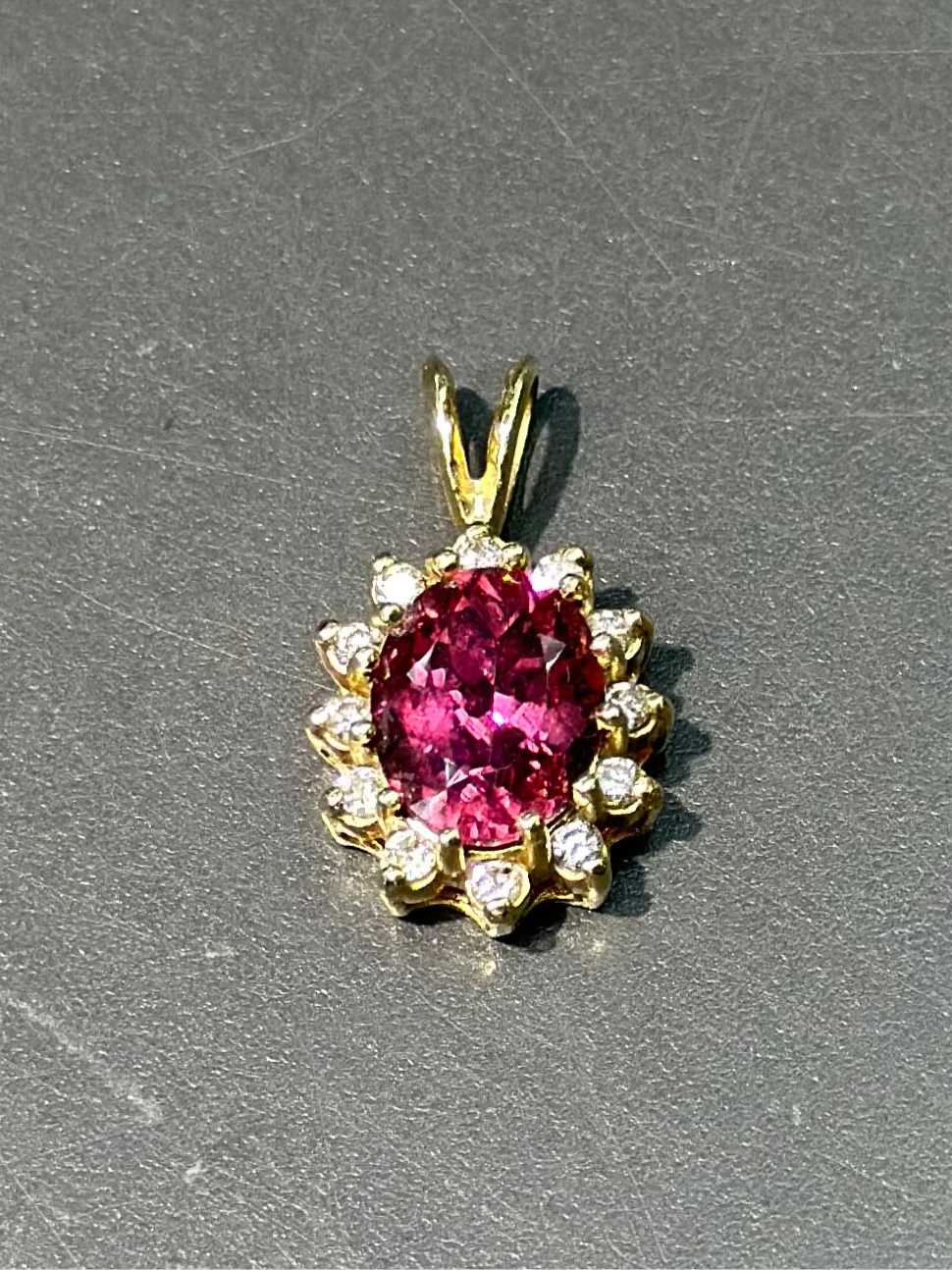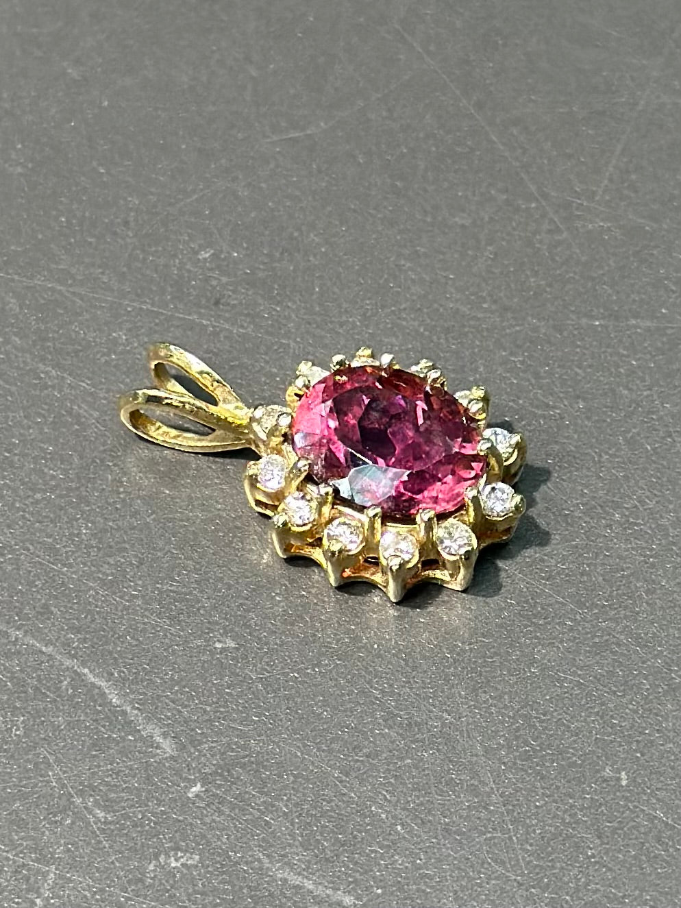 14K 金上镶嵌着一颗闪闪发光的粉红色碧玺,周围环绕着 0.12 克拉的闪亮白色钻石。
