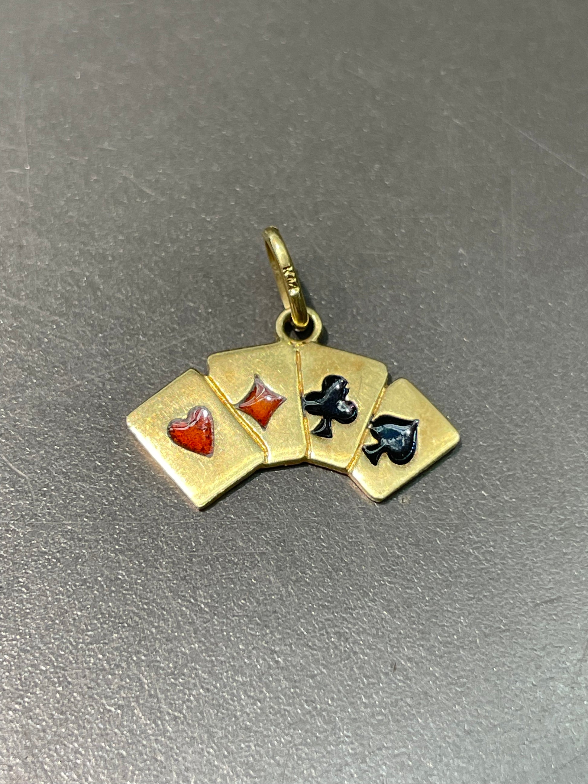 A vintage 14K gold playing card charm showing the four suits: hearts, diamonds, clubs, and spades, ornated with intricate motif detailing in the back.