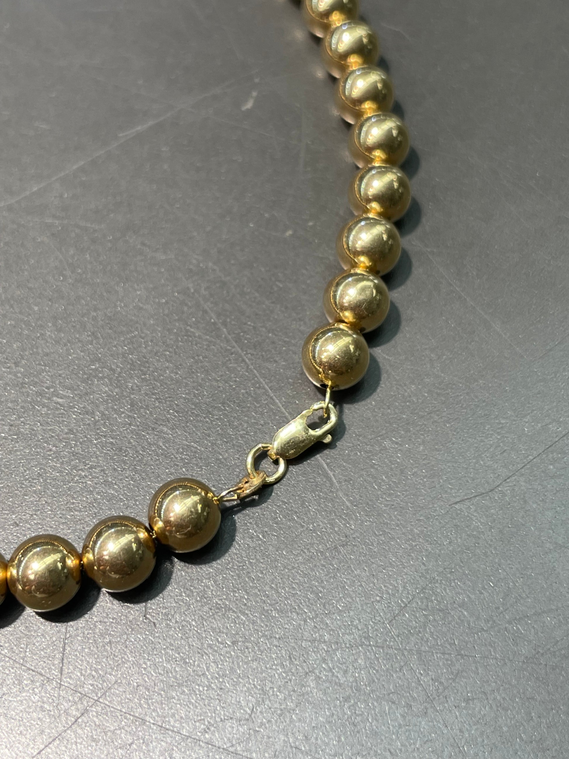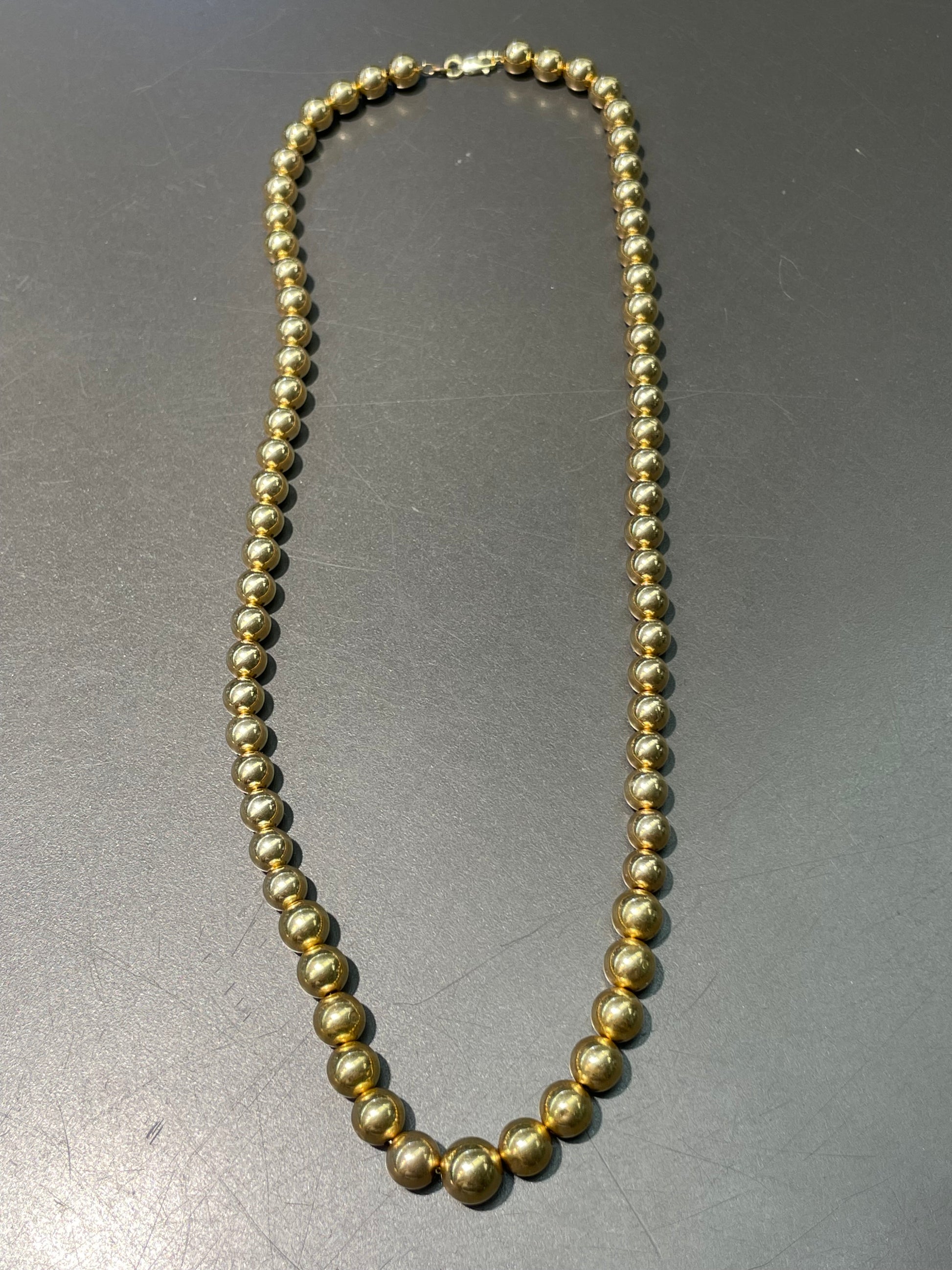 A classy vintage 14K yellow gold chain necklace strung with 14K gold graduated beads ranging from 6.0 mm to 9.0 mm secured with a lobster clasp.