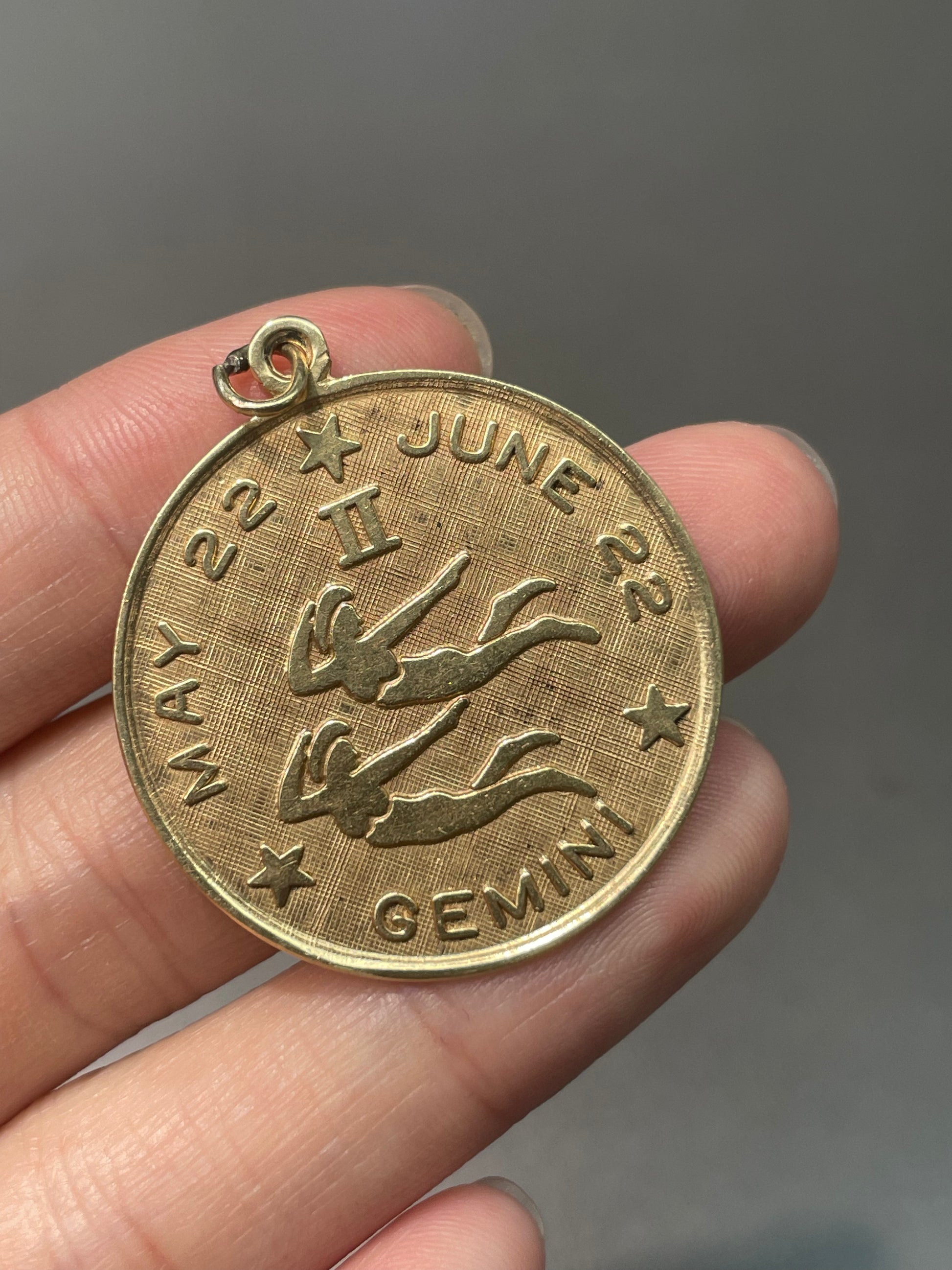A vintage 14K yellow gold horoscope pendant for Gemini. Engraving removable upon request.