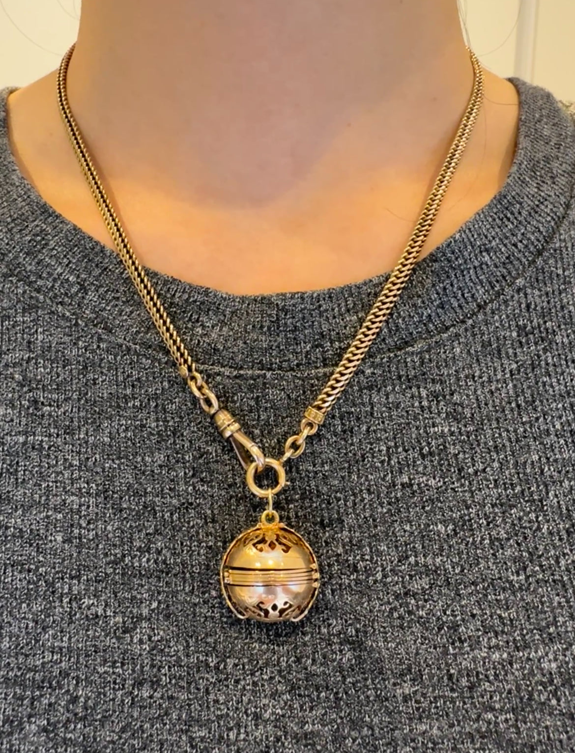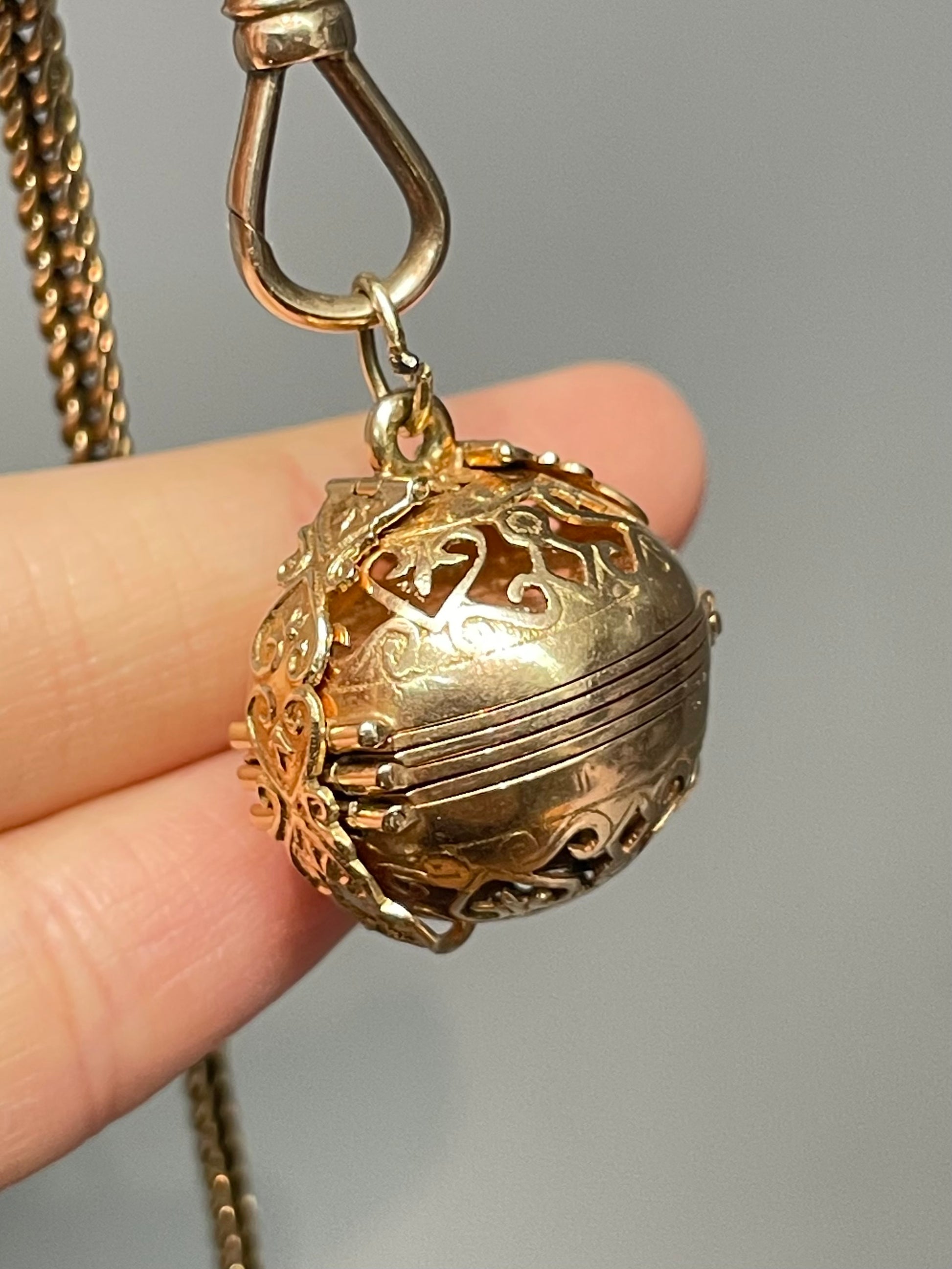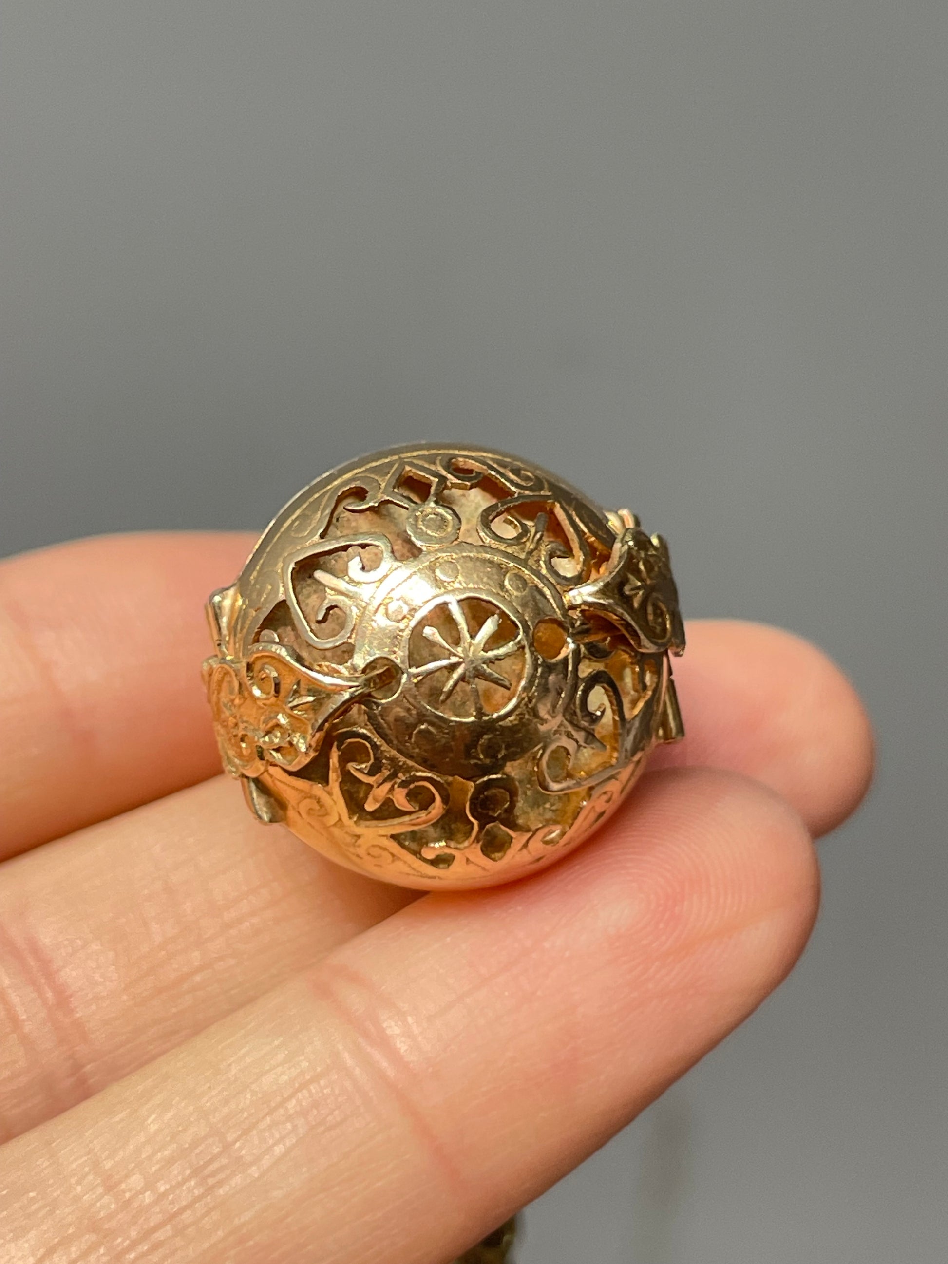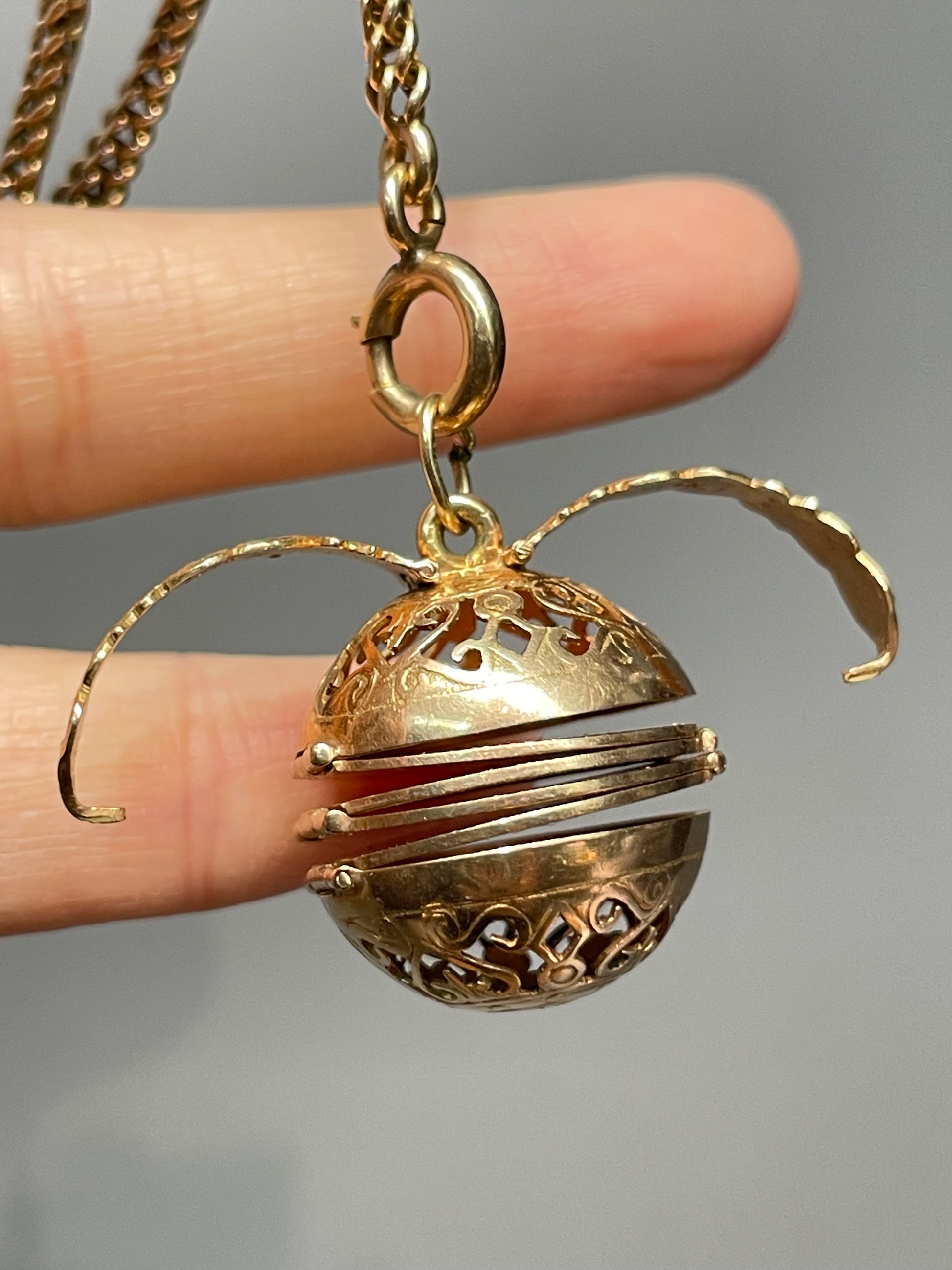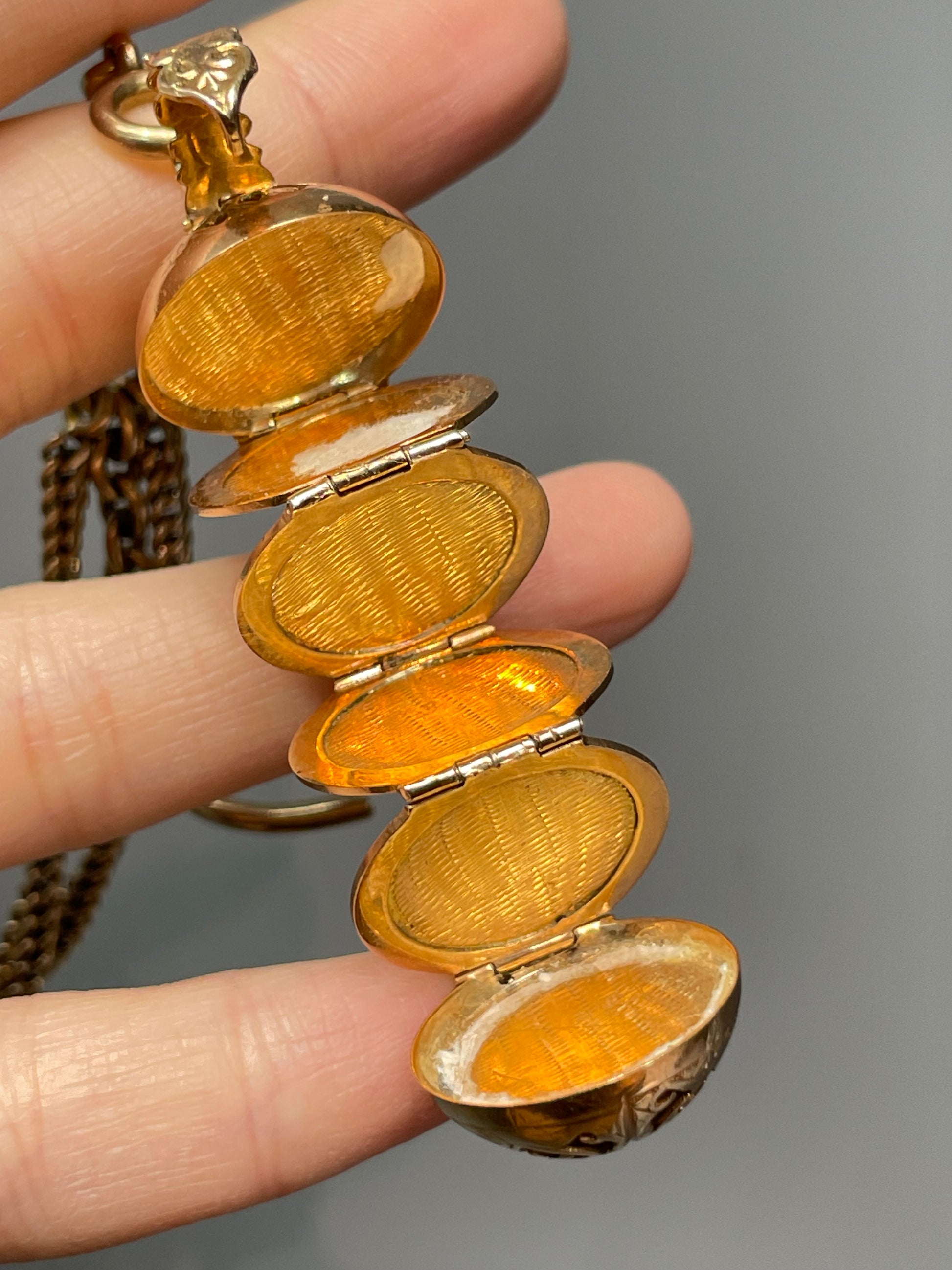 A utterly cool antique 14K gold orb locket pendant that opens up to 6 photo compartments ornated with meticulous motif detailing all around.