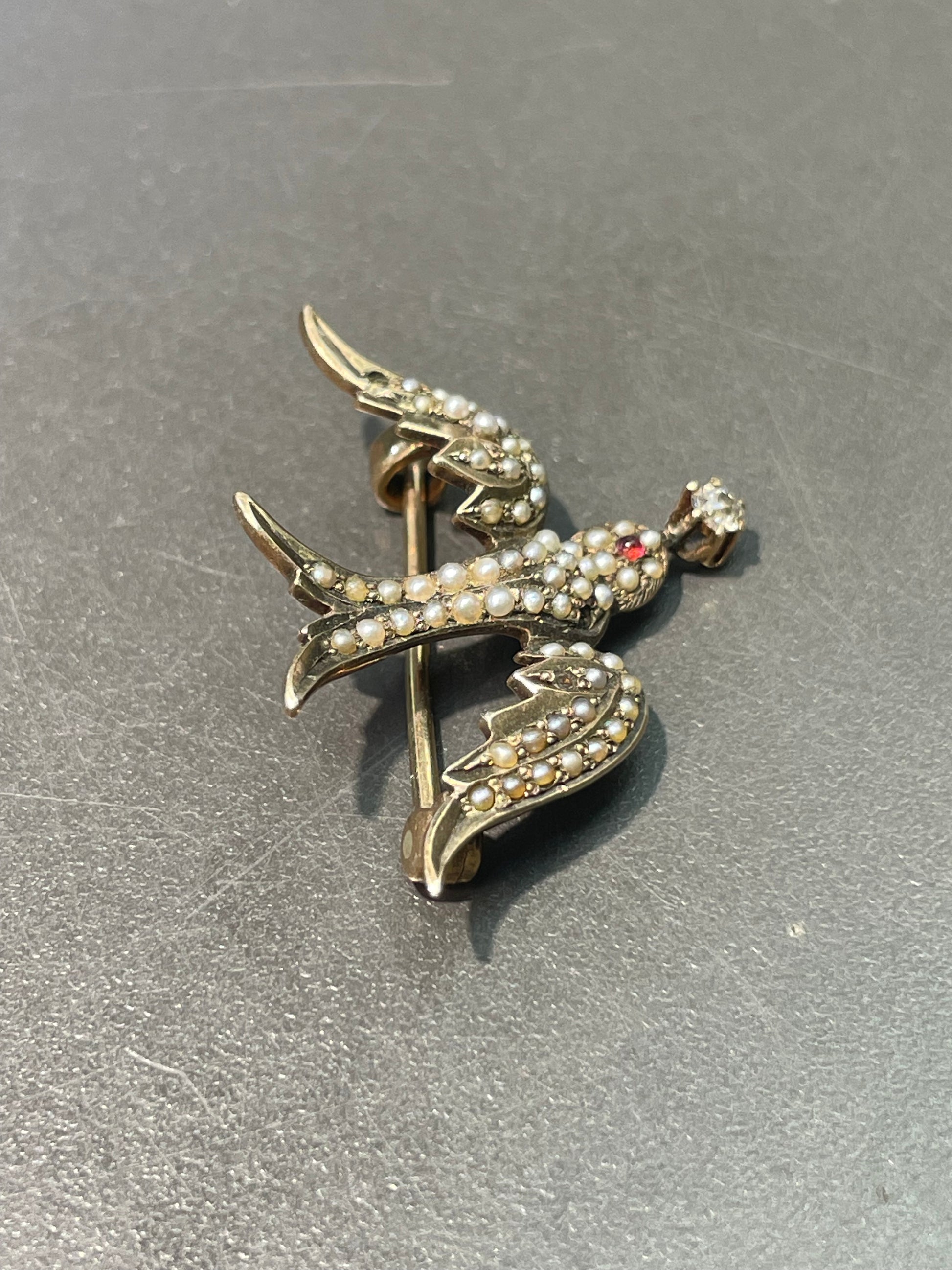 A stunning Art Nouveau 14K gold St. Esprit swallow brooch pave set with teensy tiny seed pearls, grasping on to a 0.05 carat old mine cut diamond. Convertible to pendant upon request!