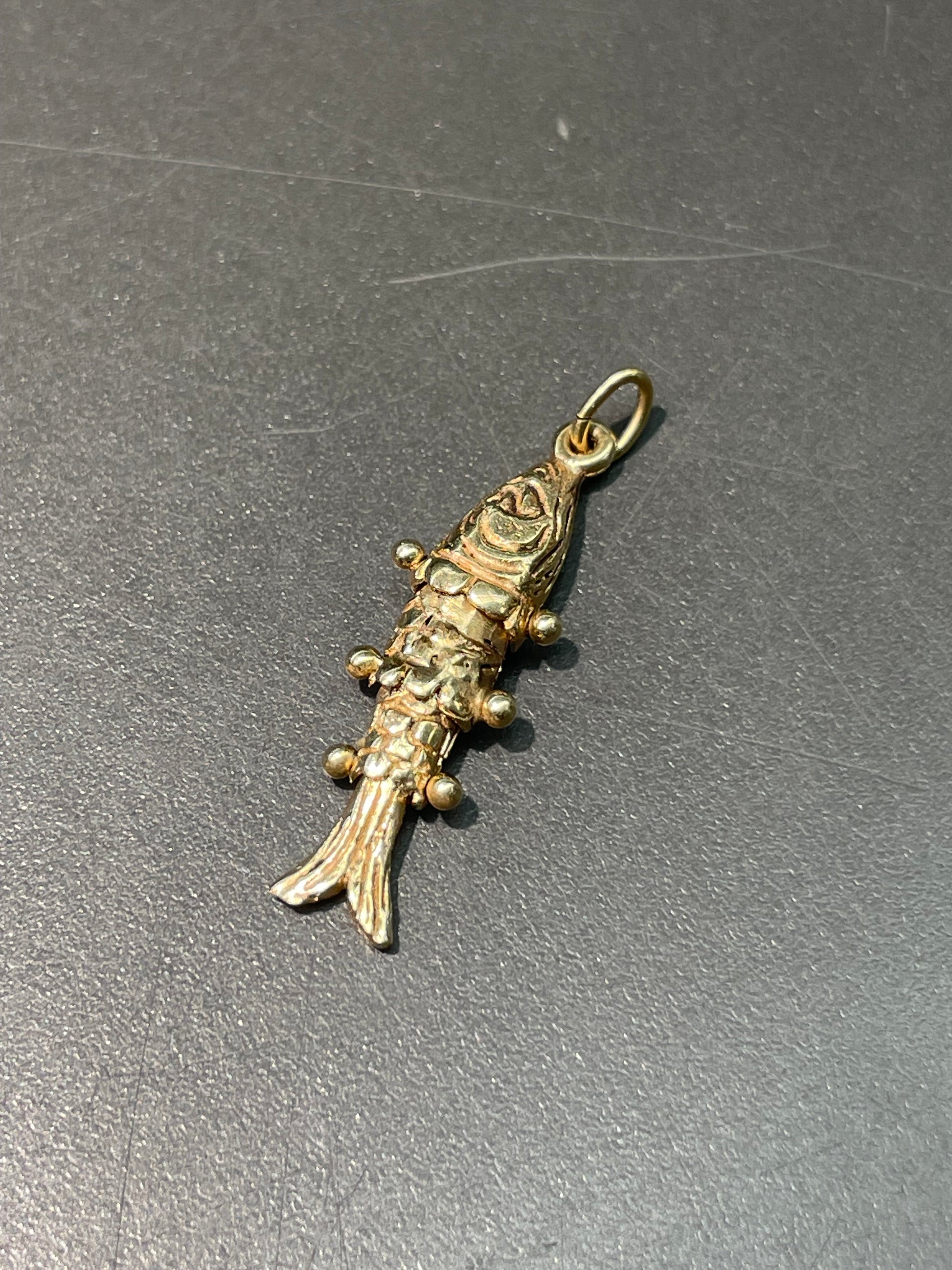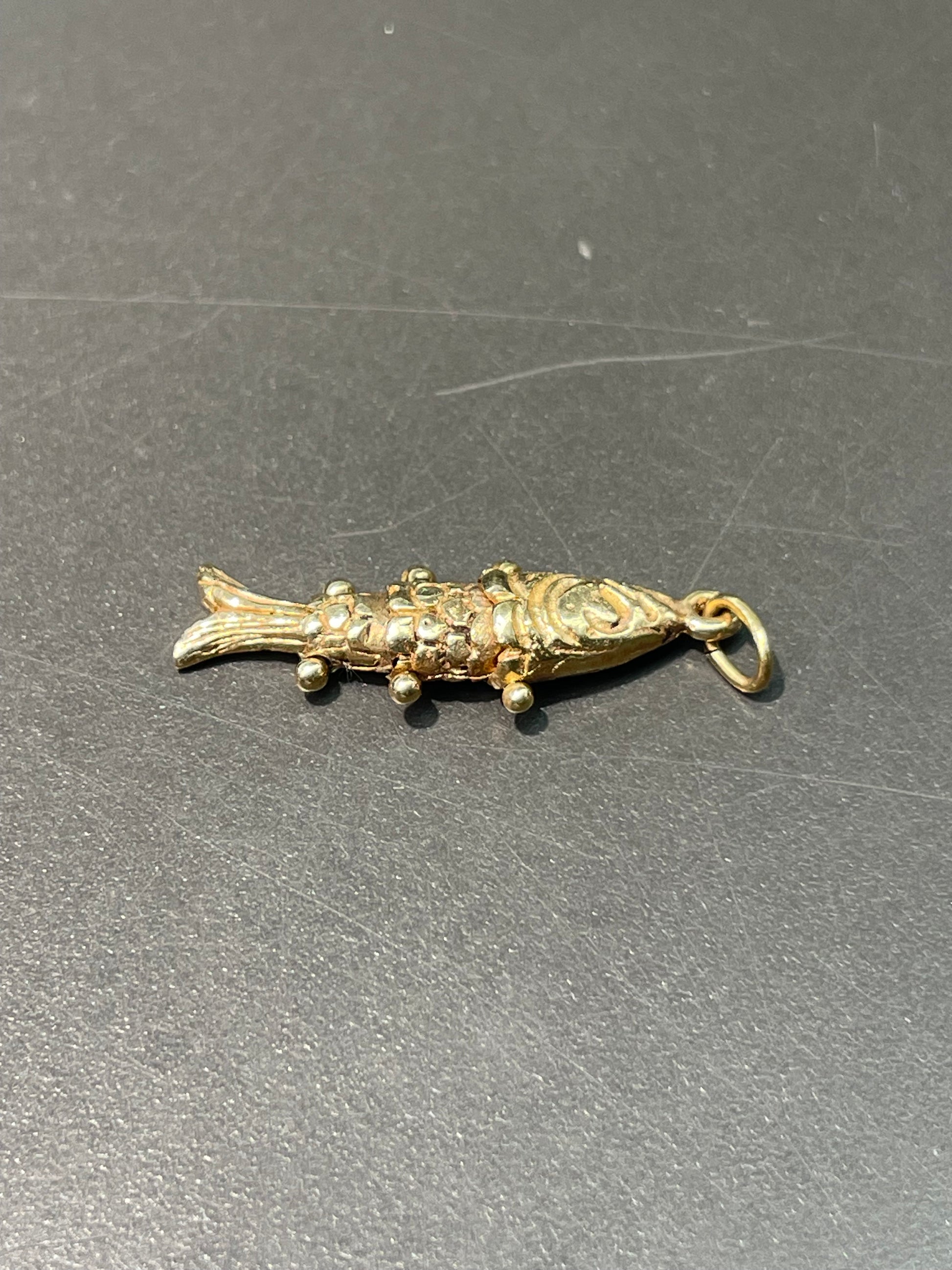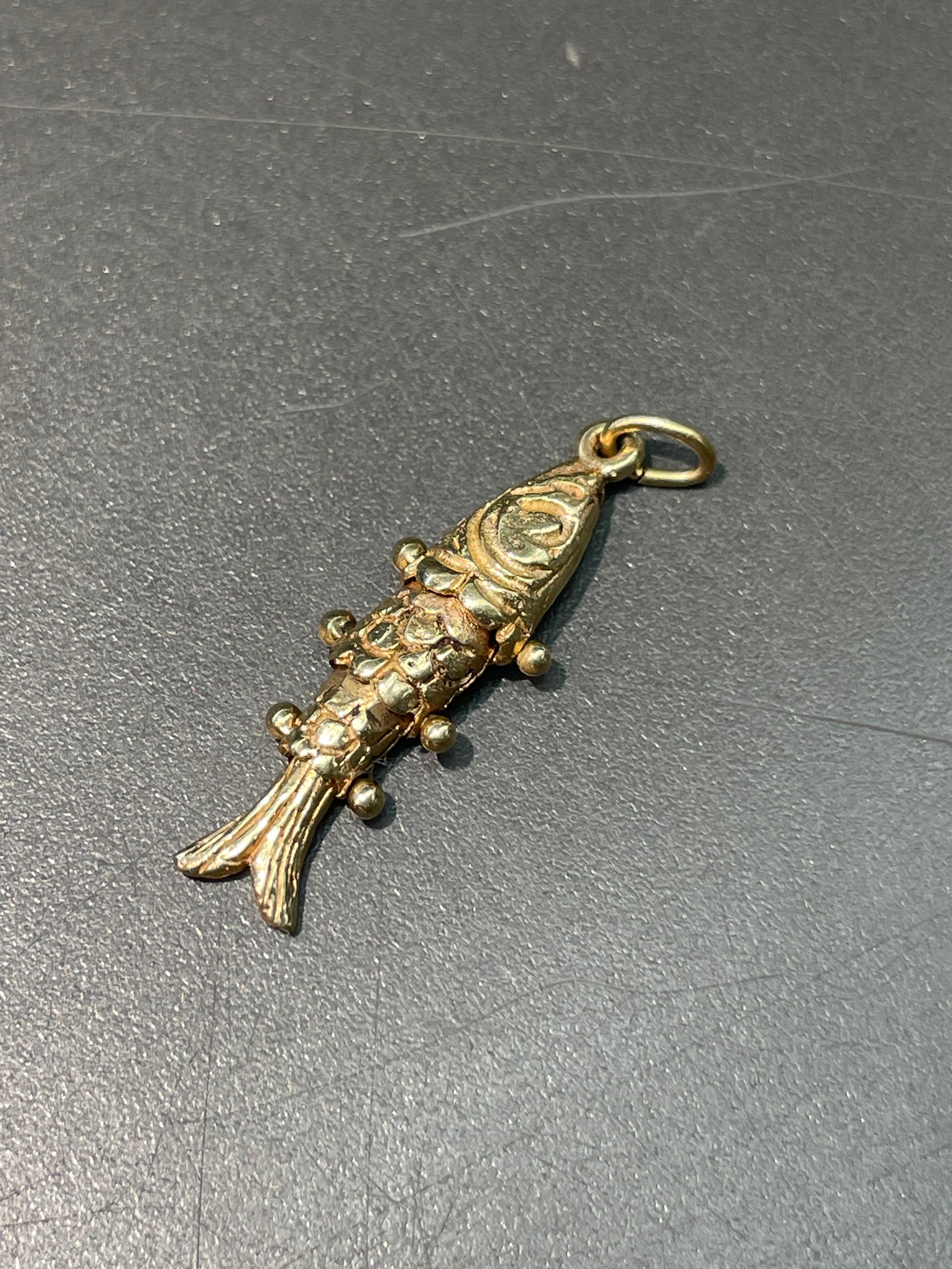 A utterly cute 14K gold articulating fish charm with moving links.