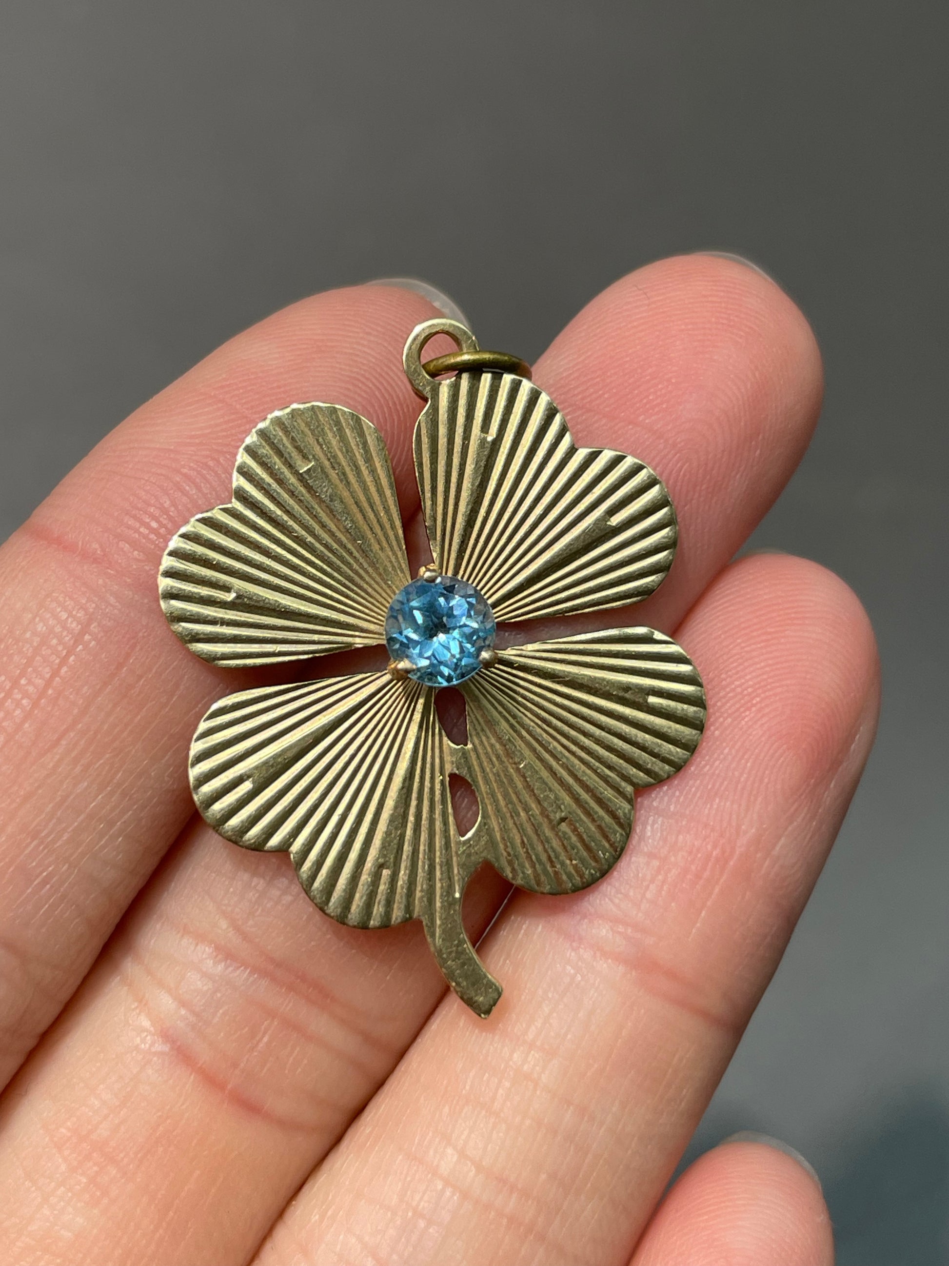 A vintage four leaf clover shamrock engine turned pendant crafted in 14K yellow gold centered with a round crystalline-blue topaz.