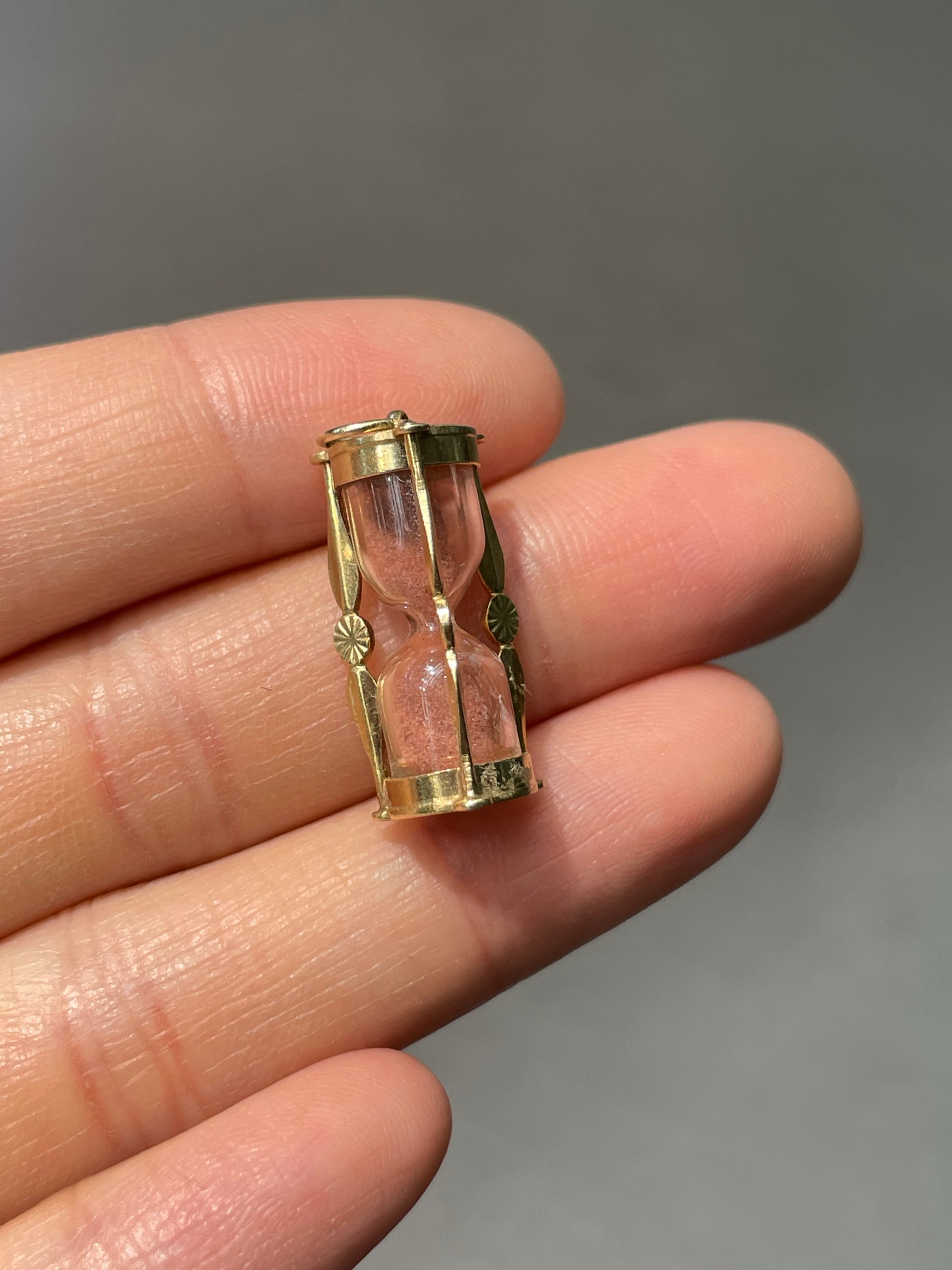 A fun and whimsical 14K gold miniature hourglass charm filled with red sand for a 5 second timer.