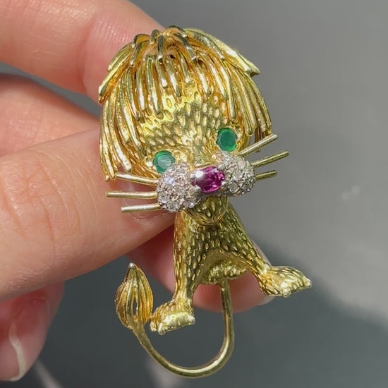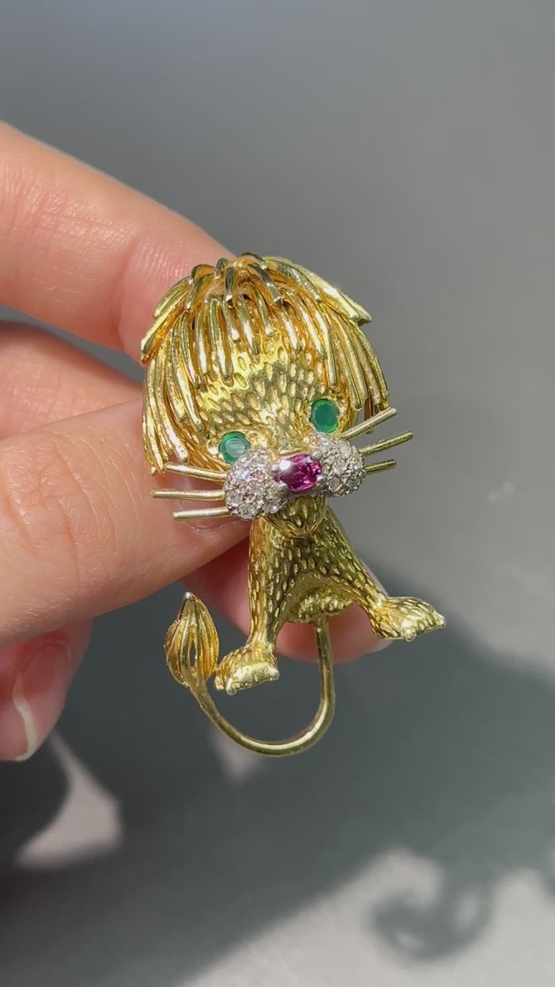 迷人的狮子胸针采用 18K 金精心雕刻而成,镶嵌着闪闪发光的绿宝石、红宝石和钻石。
