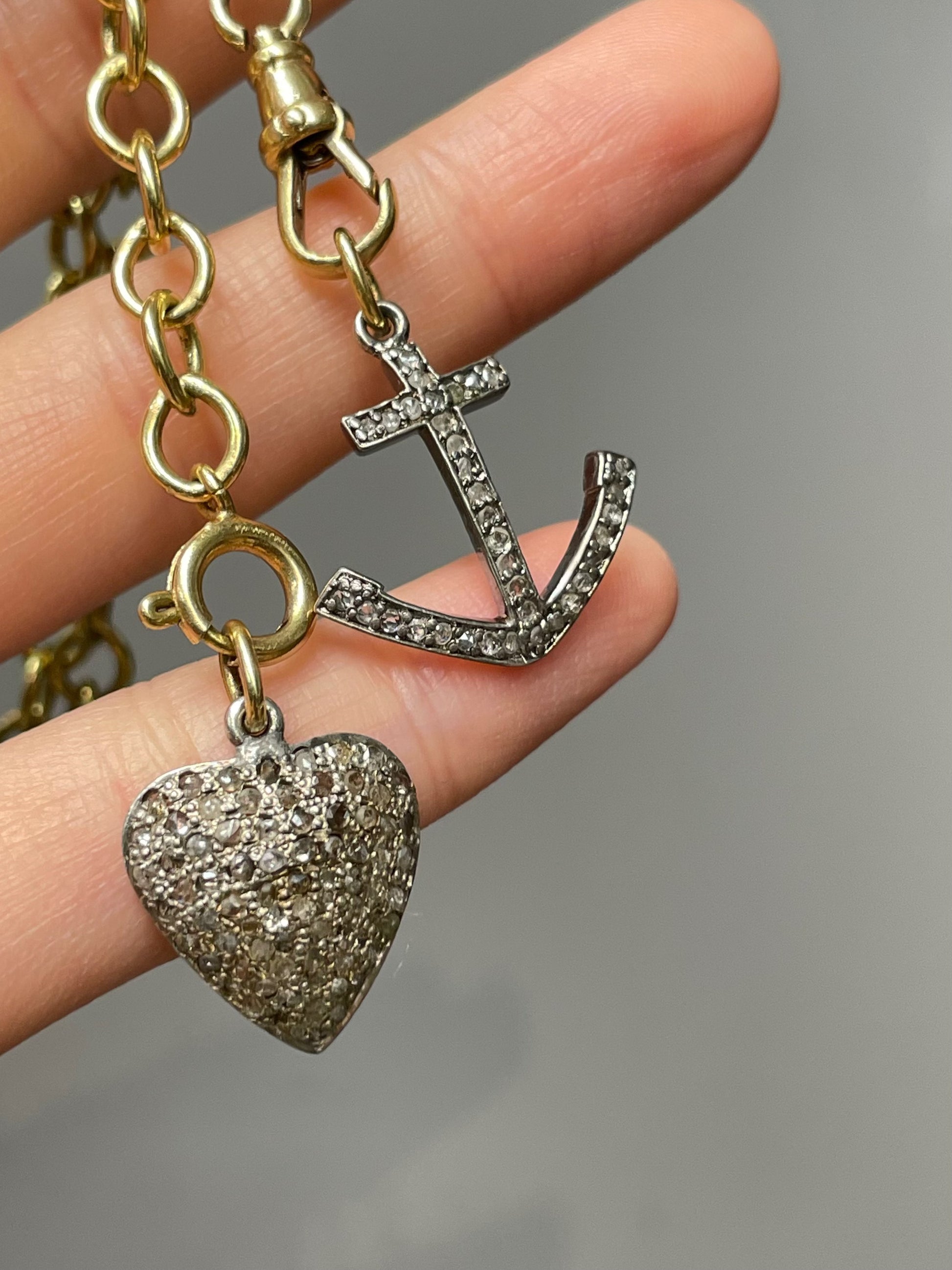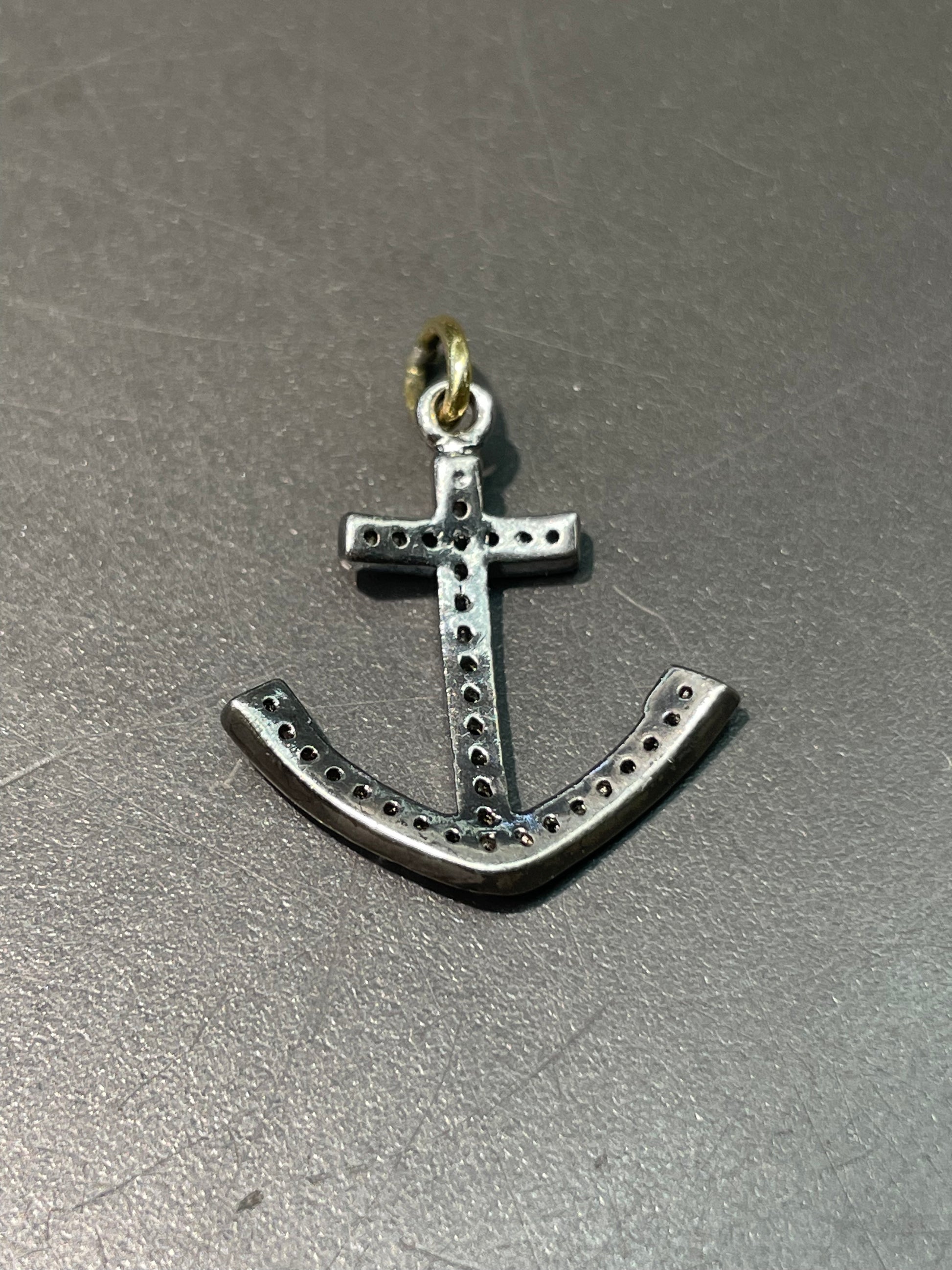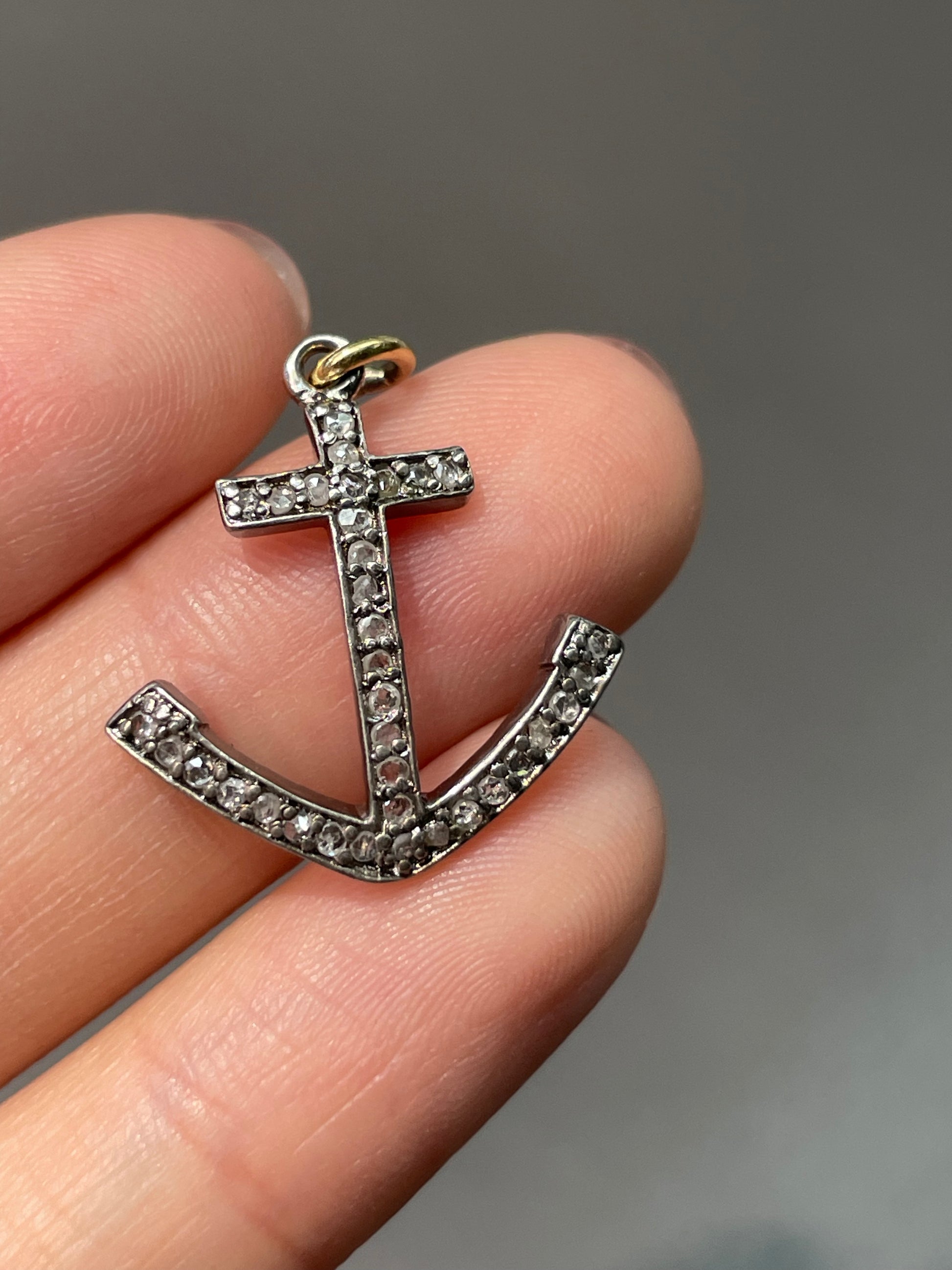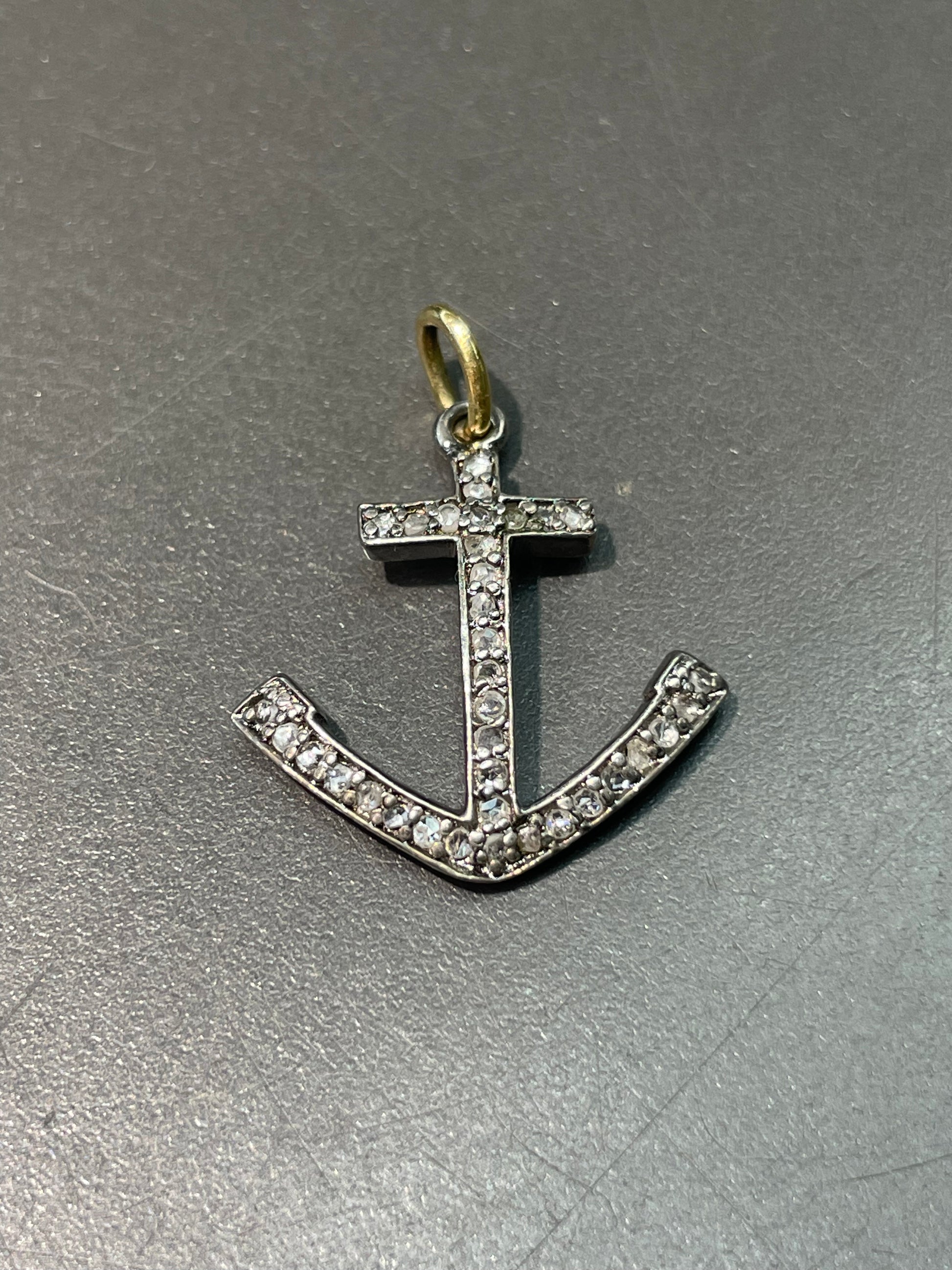 An antique style anchor pendant set with rose cut diamonds atop silver with a 18K yellow gold bail.