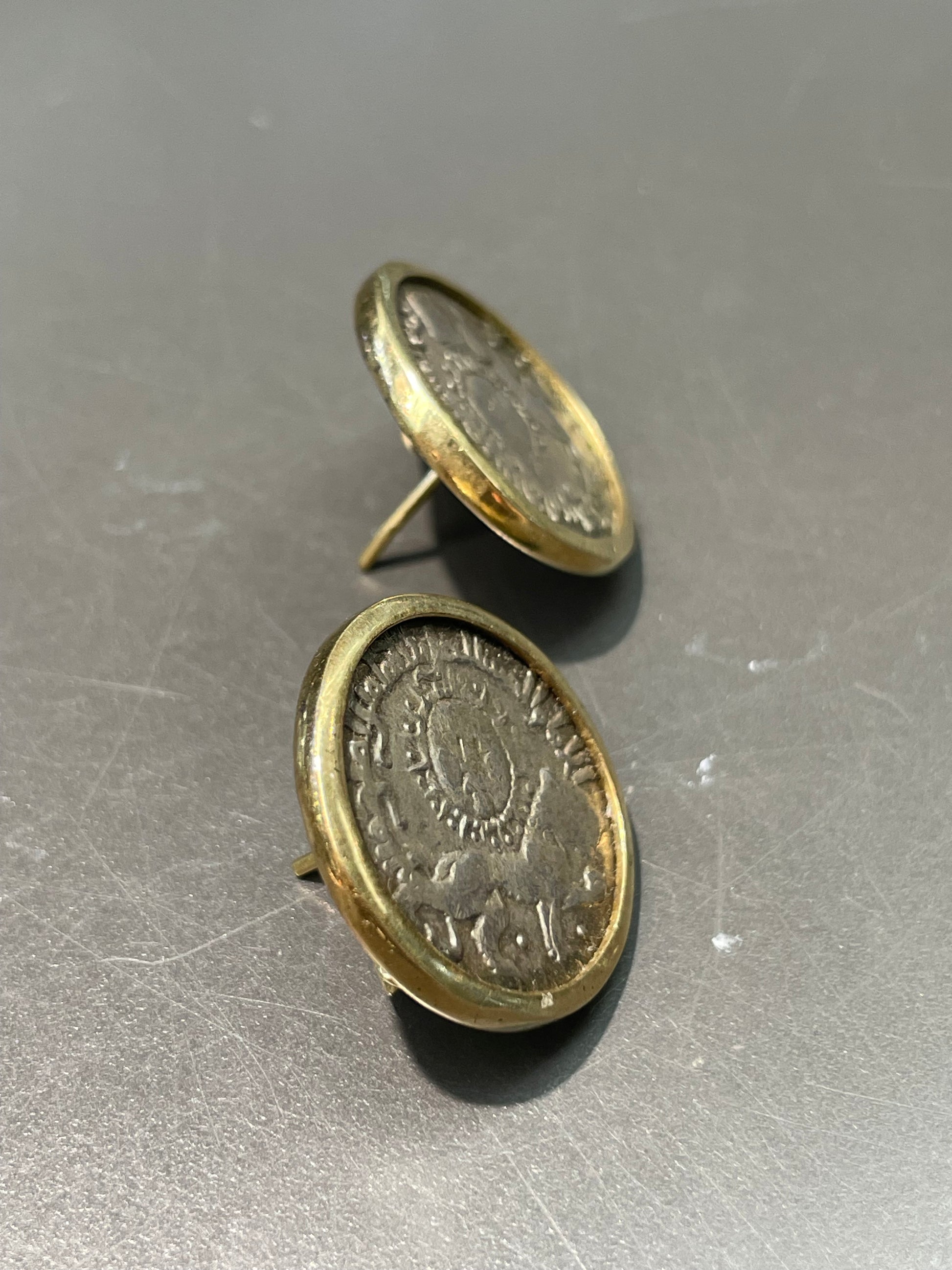 A pair of 18K yellow gold ancient roman coin earring bezeled in 14K gold.