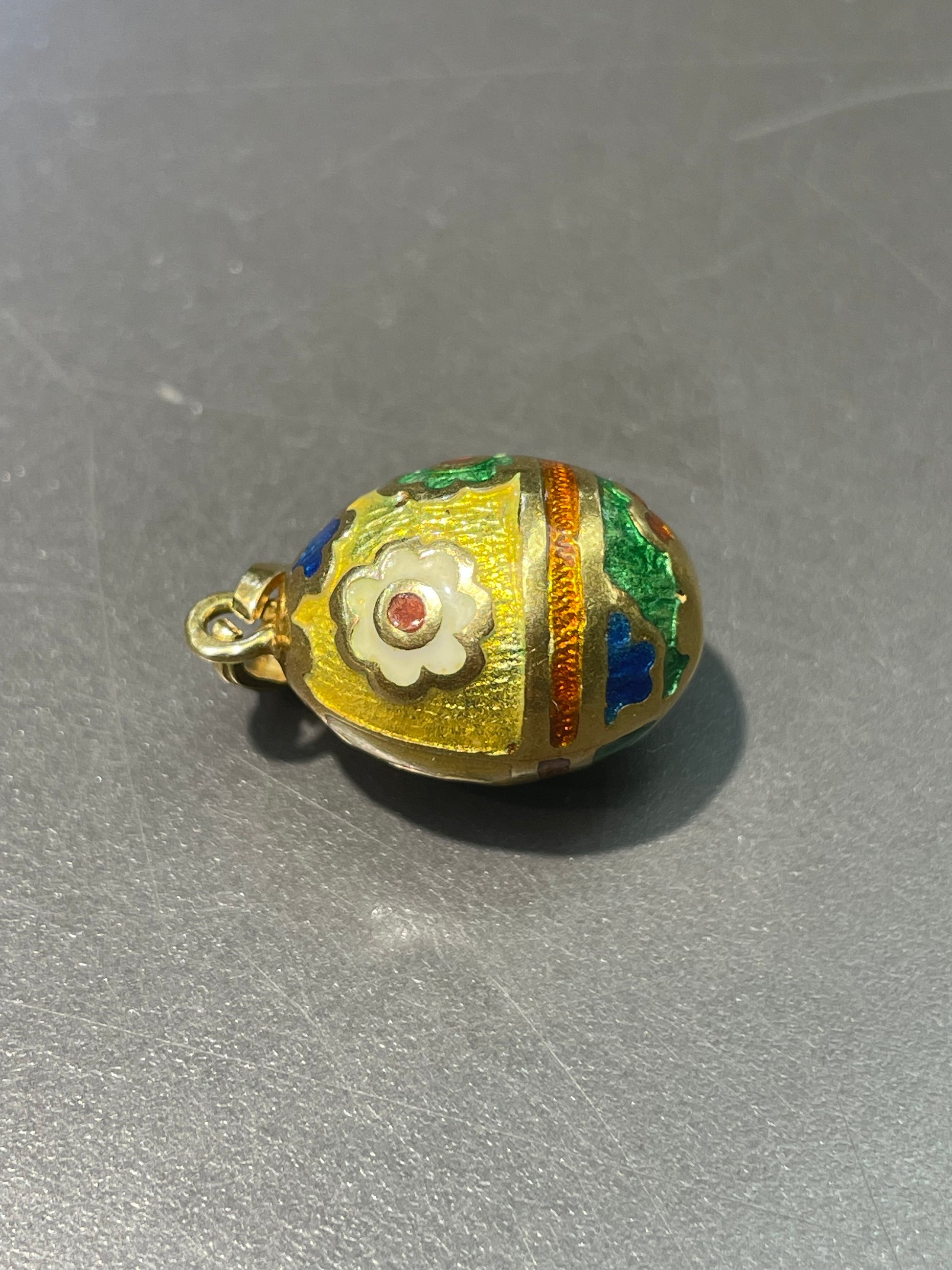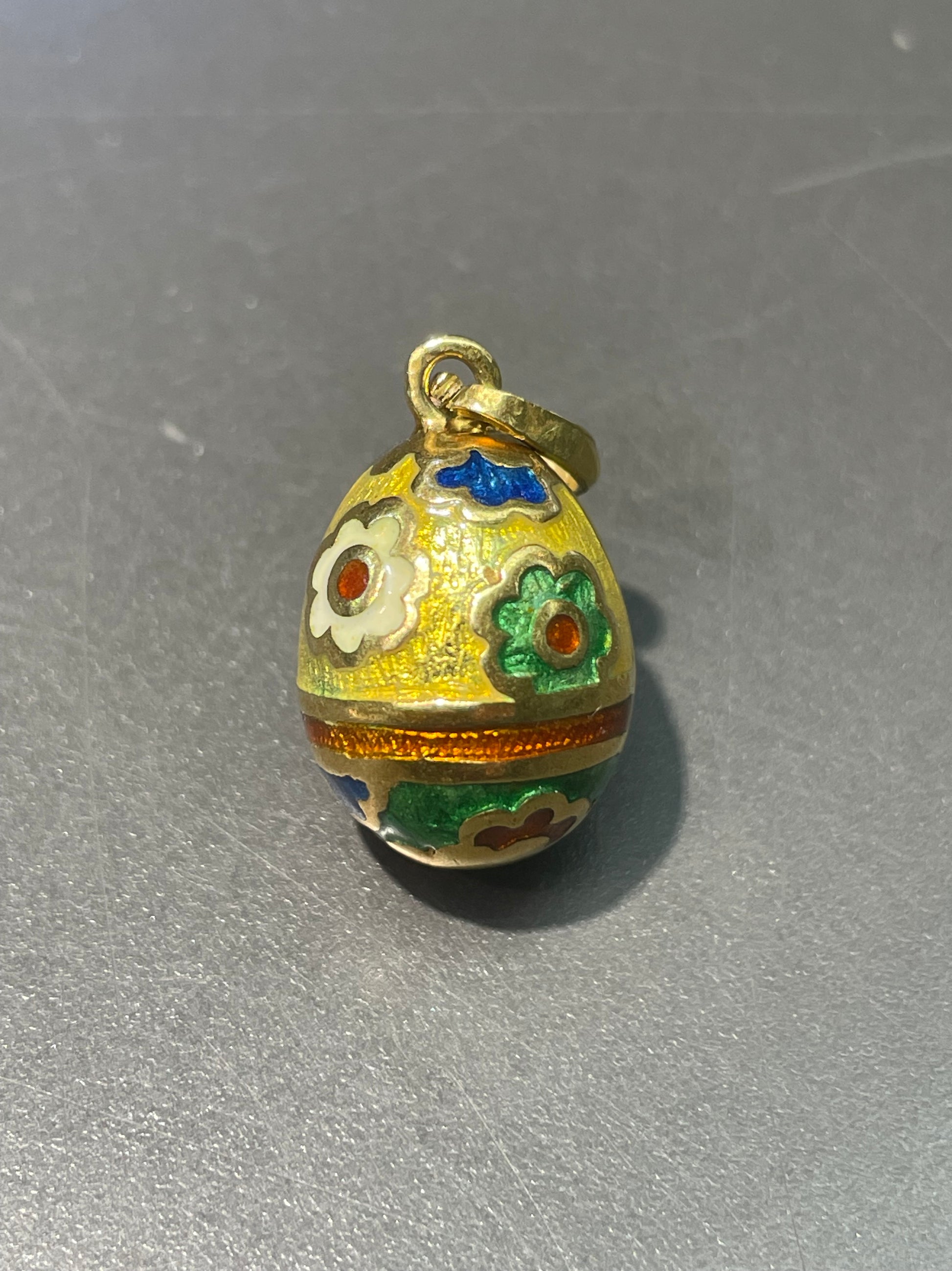 This delicate egg charm features beautiful floral enameling throughout and is crafted in warm 18K yellow gold. Its timeless design and excellent condition make it a perfect addition to any jewelry collection.