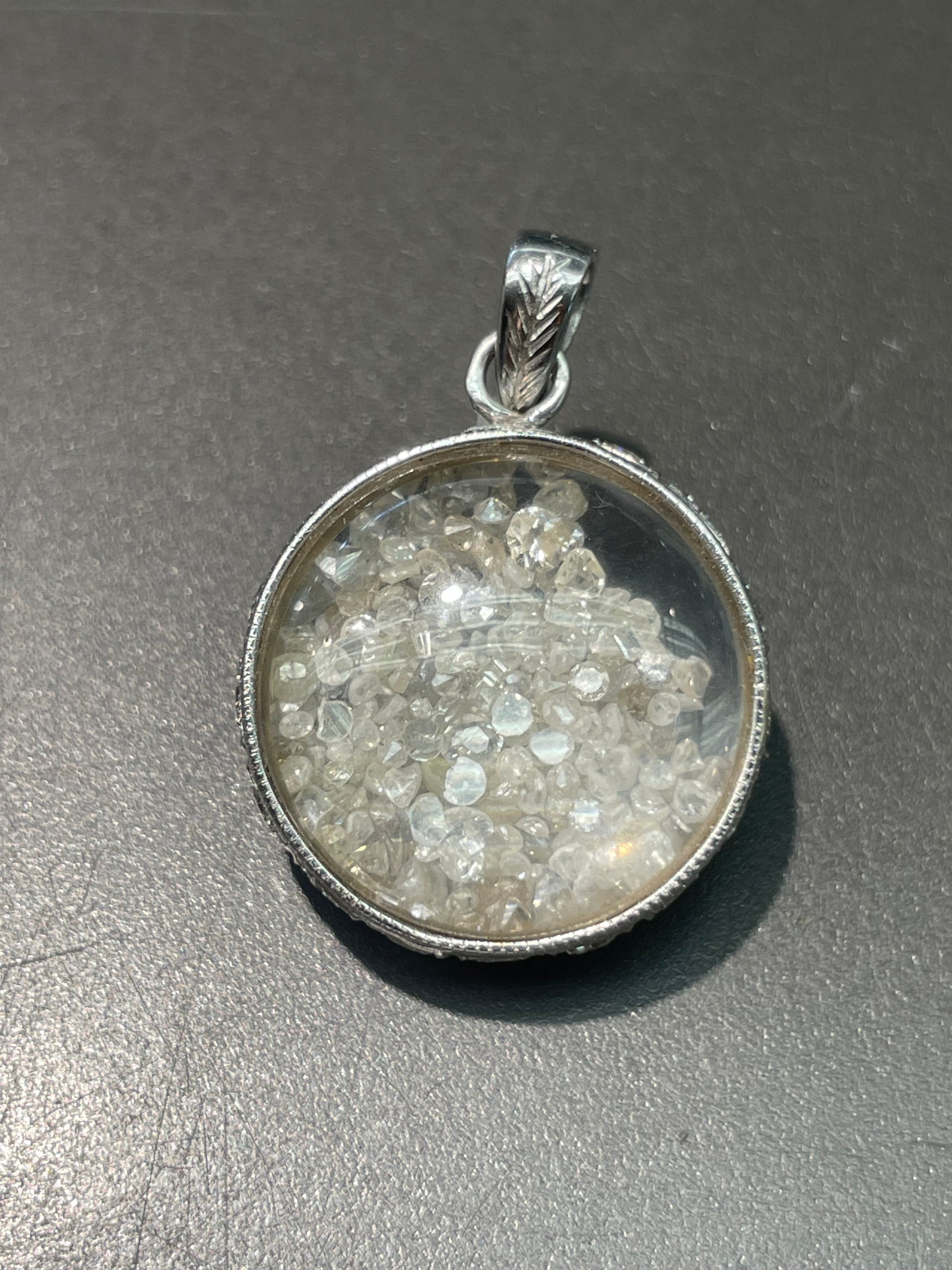 A vintage platinum diamond circle-shaped kaleidoscope shaker pendant, filled with over 5.0 carats of loose baguette, rose-cut, old mine–cut, and round diamonds. The center diamonds dance freely within the pendant, bordered by a rim of sparkling white round-cut diamonds.